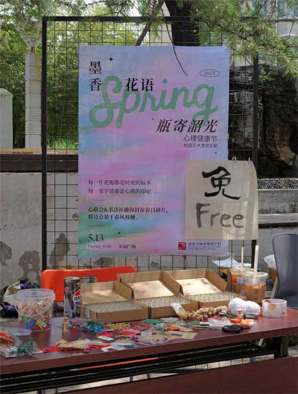 5月13日,“簃简心舍”心理辅导站举办“5·25心理健康节”系列活动,开启了 “墨香花语·瓶寄韶光” 校园艺术漂流之旅,为校园带来一场春日限定的浪漫体验,本次活动由心联会与书法社联合举办。