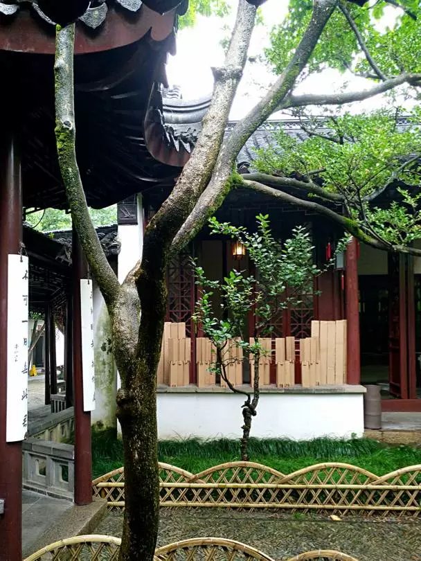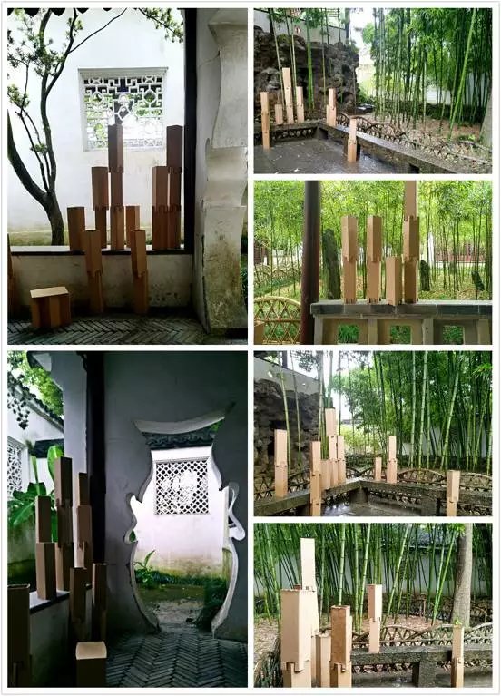 公司另一组作品名为《竹韵》,位于翠玲珑长廊转角处,取竹节的意象,设计构思是想通过高低错落的序列感觉与不同排列组合,表达园林生动丰富的韵味。在最佳观赏区另设观赏座,望人与自然相互融合,同成风景,达到填补白墙和园内景色元素的效果,与旁边的松树形成呼应关系。