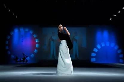 第一件为女式舞台表演装,服装灵感来源于中央电视台总部大楼建筑,将夜景下的立体建筑群和服装结合。服装正面和背面也由立体建筑作为装饰,呈现夜景下的城市风貌。为了达成整体造型的统一使用大量金属元素,极具未来科技感,表现出城市中建筑群高矮不一的布局。