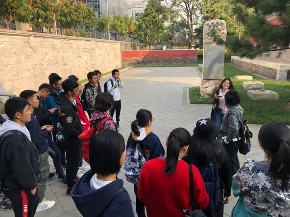 穿过车流,骑行在充满现代元素的城市中。不过多久,第一站——都城隍庙就出现在我们眼前。都城隍庙坐落于金融街街区,在高楼耸立之间,古色古香的它十分突出。经过学姐的一番讲解,同学们对古建筑有了更为深入的了解。对于城隍庙也不再是只知其名,而更添了一份熟悉。