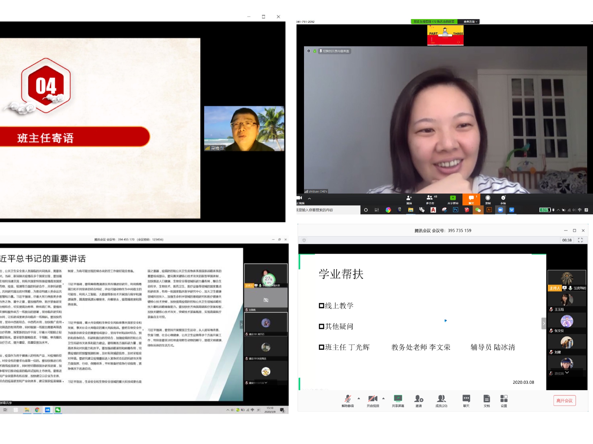班会最后,各班班主任总结讲话,针对班级实际情况对员工进行思想政治教育、心理疏导和学业就业帮扶,规181、规182班主任陈志端老师提出:规划专业的员工应该带着成长的思维前进,从城市的角度看待问题,用自己的目光留意身边城市面临极端问题所下达的决策和采取的措施,坚信在党和国家的领导下,人民一定可以战胜困难。