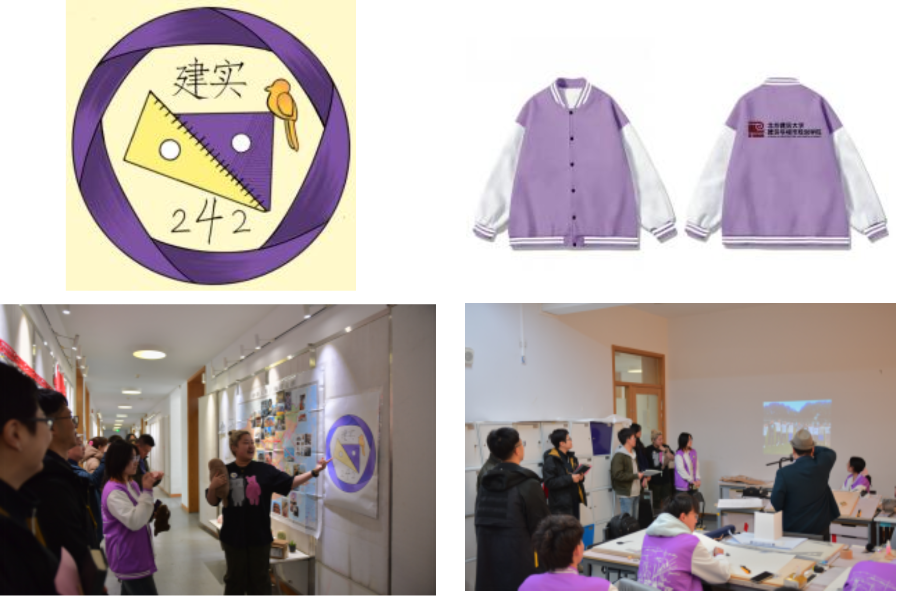 建实242班的主题是帅獭王国,帅獭是班级班长的代号。班徽,紫黄配色是两种卡套的颜色,六边形的轮廓代表我们都希望成为六边形战士,鸟一个是因为公司有很多鸟,也代表同学们展翅飞翔。我们班是一个充满活力与激情的集体,展示墙上面是每一个同学的生活照和自己家乡的建筑照片,用丝带牵到了同一个地方——北建大,我们在这里相遇相识。“学海无涯乐作舟”是我们班班训,虽然我们学习设计任务很重,经常要通宵做模型,但是我们会在专教唱歌聊天,在一种放松的状态下学习生活,保持乐观开朗的态度。