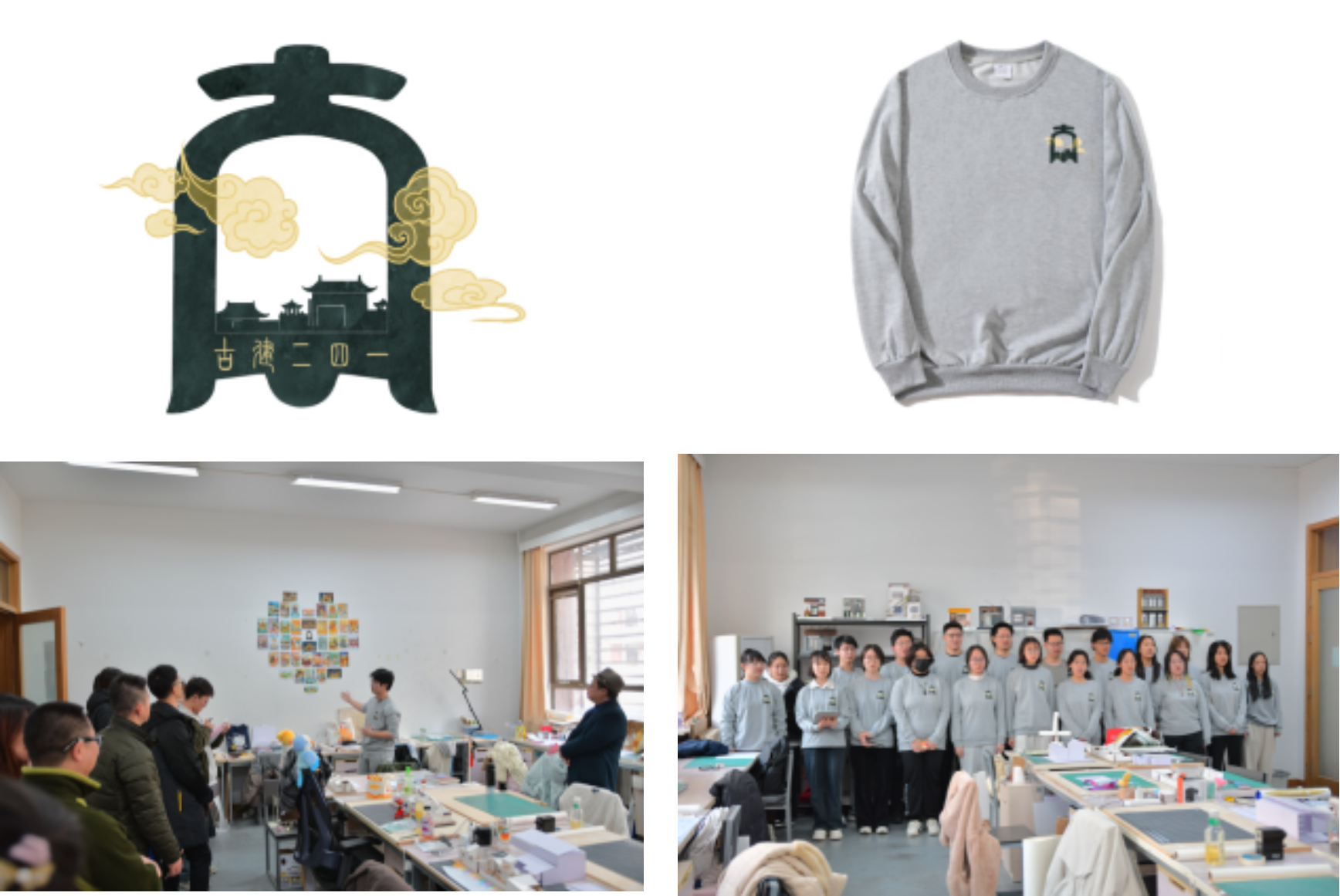 班徽以青铜古钟为主体,四周环绕金色祥云。青铜古钟镂空,呈现“古”字,点明专业;古钟中间绘有古建筑群,以图形语言刻画“建”字。古钟中下部运用小篆字体写明专业及班级。在风采展示活动的最后,古建241的同学们齐唱《明天会更好》,表达全体同学对未来五年学习生活的期待与乐观面对生活的决心。