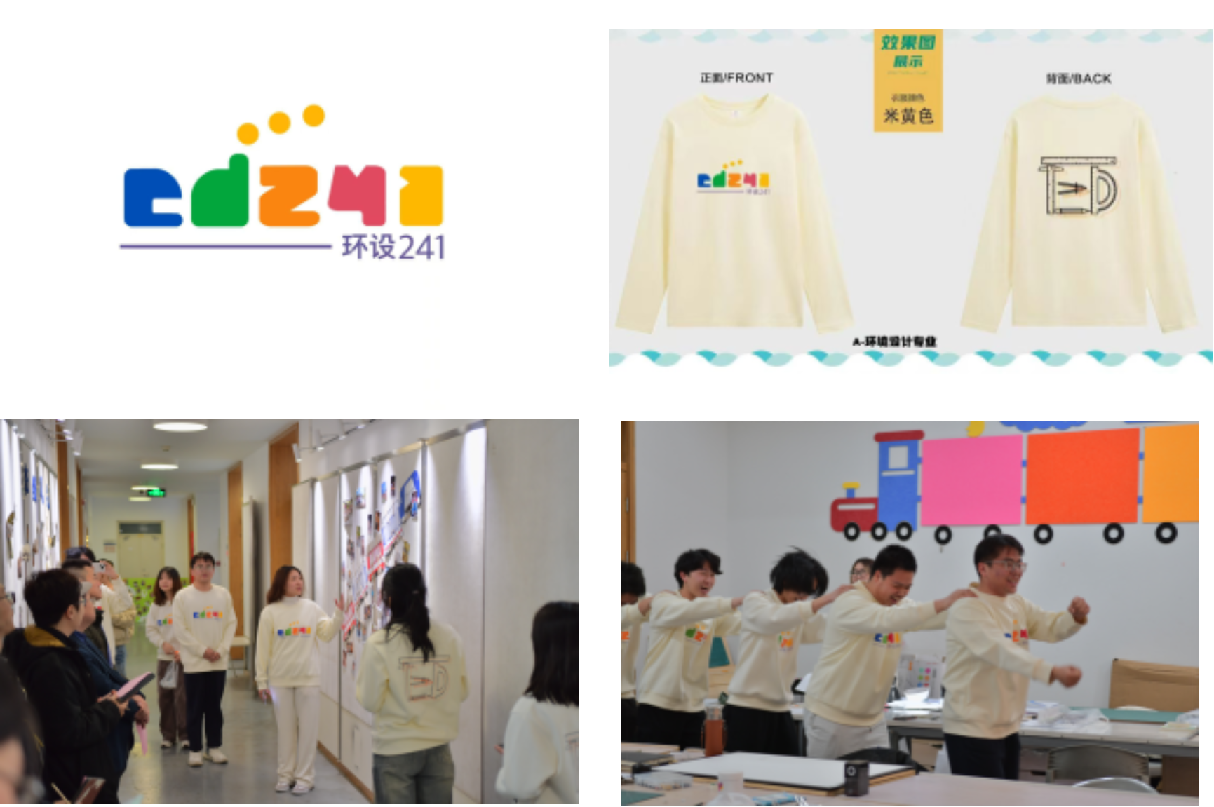 环设241以火车为主题,展示墙的火车承载着各位同学的照片,把五湖四海的同学联系在一起,专教的火车图片搭配着火车的内饰结构,更体现了环设火车这一主题,班服班徽既体现了火车车头,又体现本专业的特色。环设241所有同学乘坐在一列火车上,在各自的领域里不断提升!也希望这列火车一如既往的阳光、团结、上进,驶向更美好的未来!