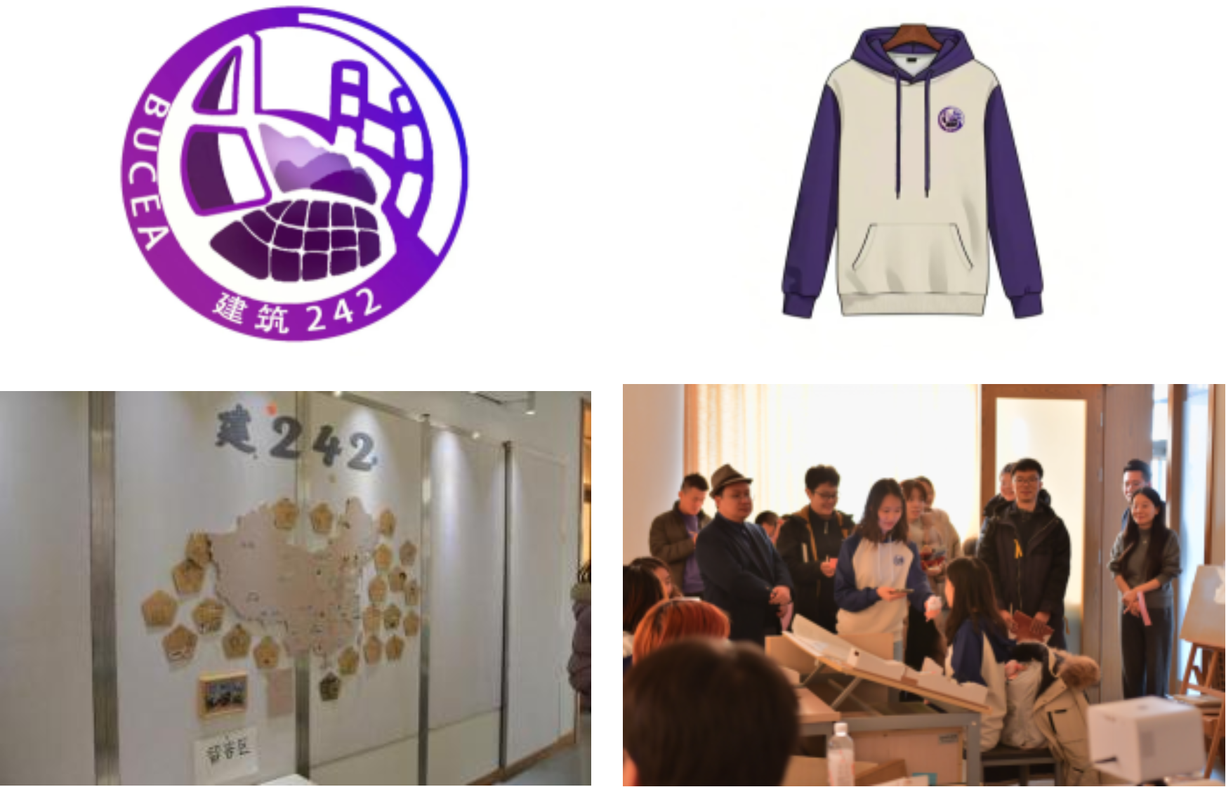 建242以新闻社为主线故事,通过展示墙的地图,介绍了同学们来自天南地北的青春乐章。班徽以田野与建筑相称为图样,承载着学于建筑,回馈自然的美好愿景。班服是经典的建大紫色调,传承着一代代建大人实事求是精益求精的校训精神。建242以“校园怪谈”的形式,讲述了校园中曾发生过的碎片故事,在古怪离奇的风格背后,是学习建筑每一个日夜的苦与乐,用新闻的报道的形式,诉说着我们对建筑的无限热爱与不懈追求。