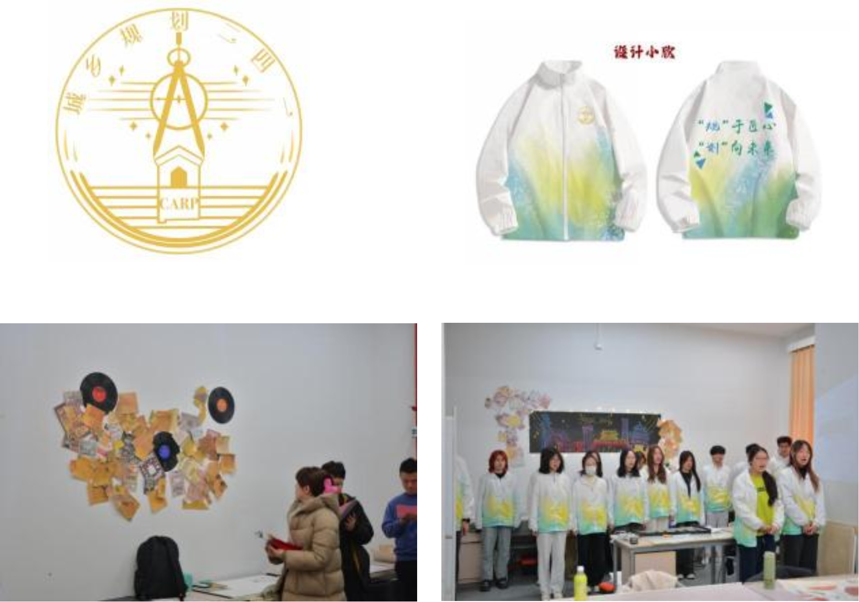 规241以城市之光为主题,外墙采用了以网格为底板,用照片的形式将我班18个同学围绕在班主任刘剑峰老师的周围,象征着团结和和谐。展板一边以城乡规划例图为中心,地图为装点,掺杂世界地图的形式,一边是古今的北京地标启示同学们做规划要眼光开阔,要与国际接轨,与世界同频共振,蕴含了同学们的理想愿景。黄绿渐变设计的班服,象征着自然、生机、希望和活力。班训“‘规’于匠心,‘划’向未来”寓意着城乡规划能够为城市和乡村带来美好的未来。在最后的合唱与器乐表演中,一首《北京欢迎你》在钢片琴的欢快和旋里,绽放了青春与活力,让在场的每一位老师和同学们,都感受到了片刻的欢乐、宁静和温暖。