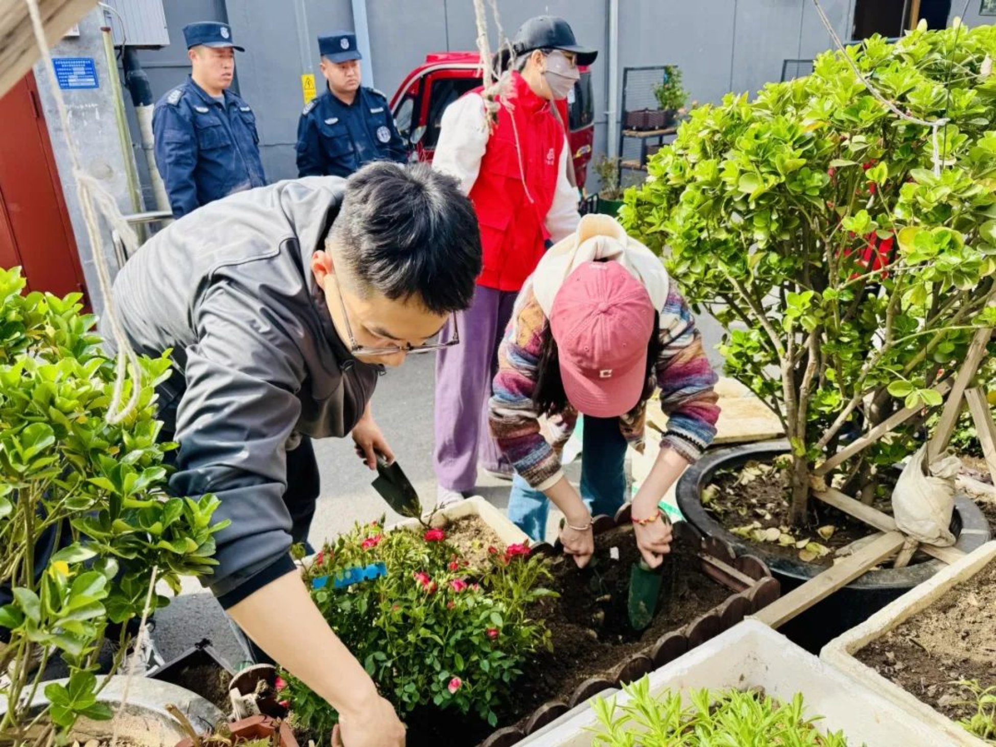 活动当天,赵锥子胡同农园、铺陈市胡同及鹞儿胡同三处场地7个节点同时开展播种工作。赵锥子胡同农园内,师生与居民配合默契,有的翻土松地、有的栽种幼苗、有的负责浇水养护,种植了西红柿、茄子、辣椒等春季蔬菜以及月季等花卉。老员工党员结合专业知识,为居民讲解植物习性与种植技巧,制作了通俗易懂的“种植小贴士”供现场居民学习交流;铺陈市胡同和鹞儿胡同则以花卉换盆和补种为重点,全面提升了胡同的绿化品质与景观效果。