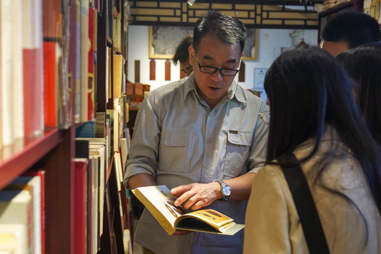 在西四南大街有一家与800余年的万松老人塔为邻的书店——正阳书局,这是北京目前唯一一家只经营北京文献书籍的特色书店。书局里古色古香的内饰,洋溢着浓浓的老北京胡同氛围,在这样具有年代的感的书局里,何书记和正阳书局创始人崔勇一起给同学们介绍了书店的由来,古代建筑的构建、装饰、隔扇等等,同学们在两位老师的讲解中对古书和古建筑有了新的认识。