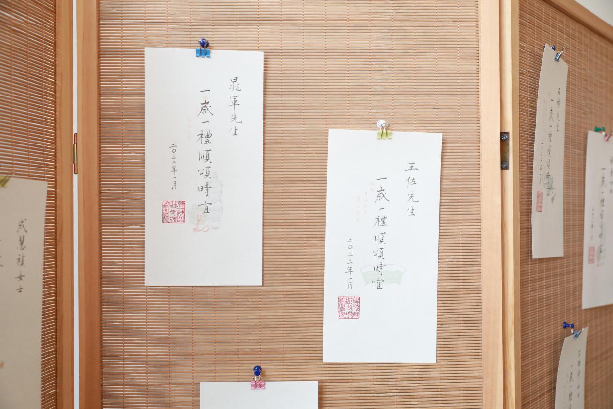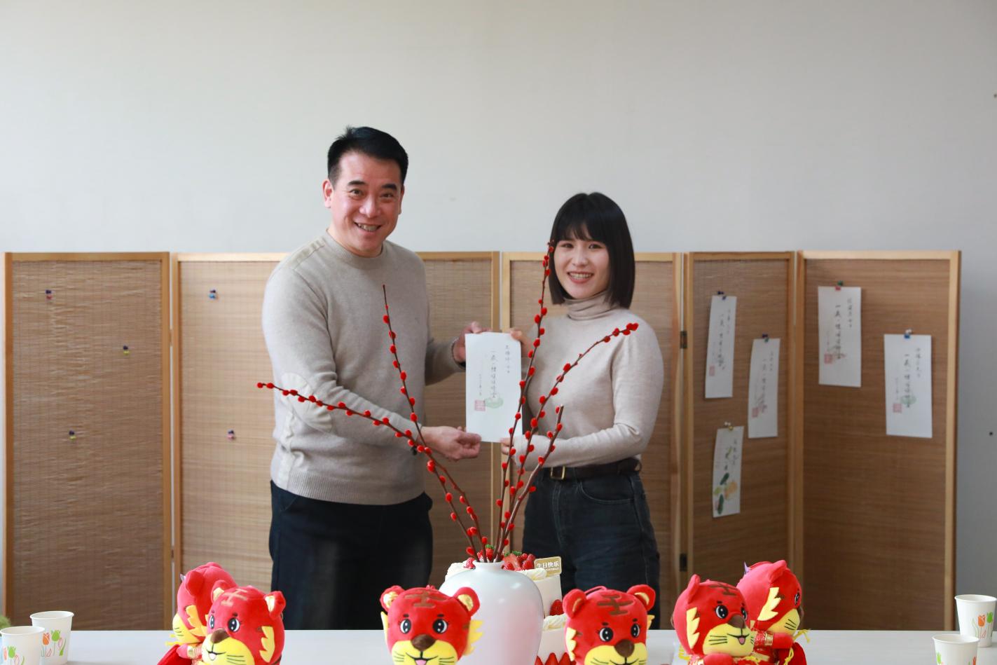 特别要强调的是,今年的生日贺卡亮点颇多:贺卡选用清秘阁的纸张,其上的书法“一岁一礼、顺颂时宜”由公司退休教师李沙教授亲笔书写,印章则由杨振老师精心刻制。何书记为到场的福星们颁发生日贺卡,卡片虽小却倾注了满满的爱与祝福。老师们纷纷拍照留念,定格幸福瞬间。