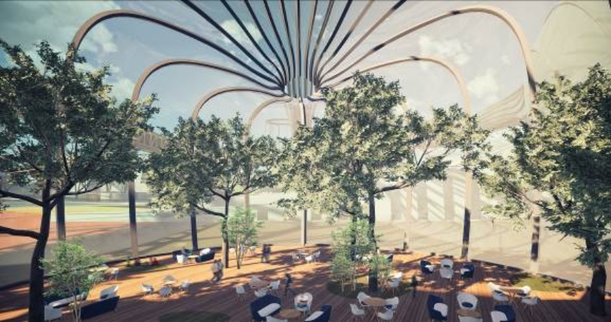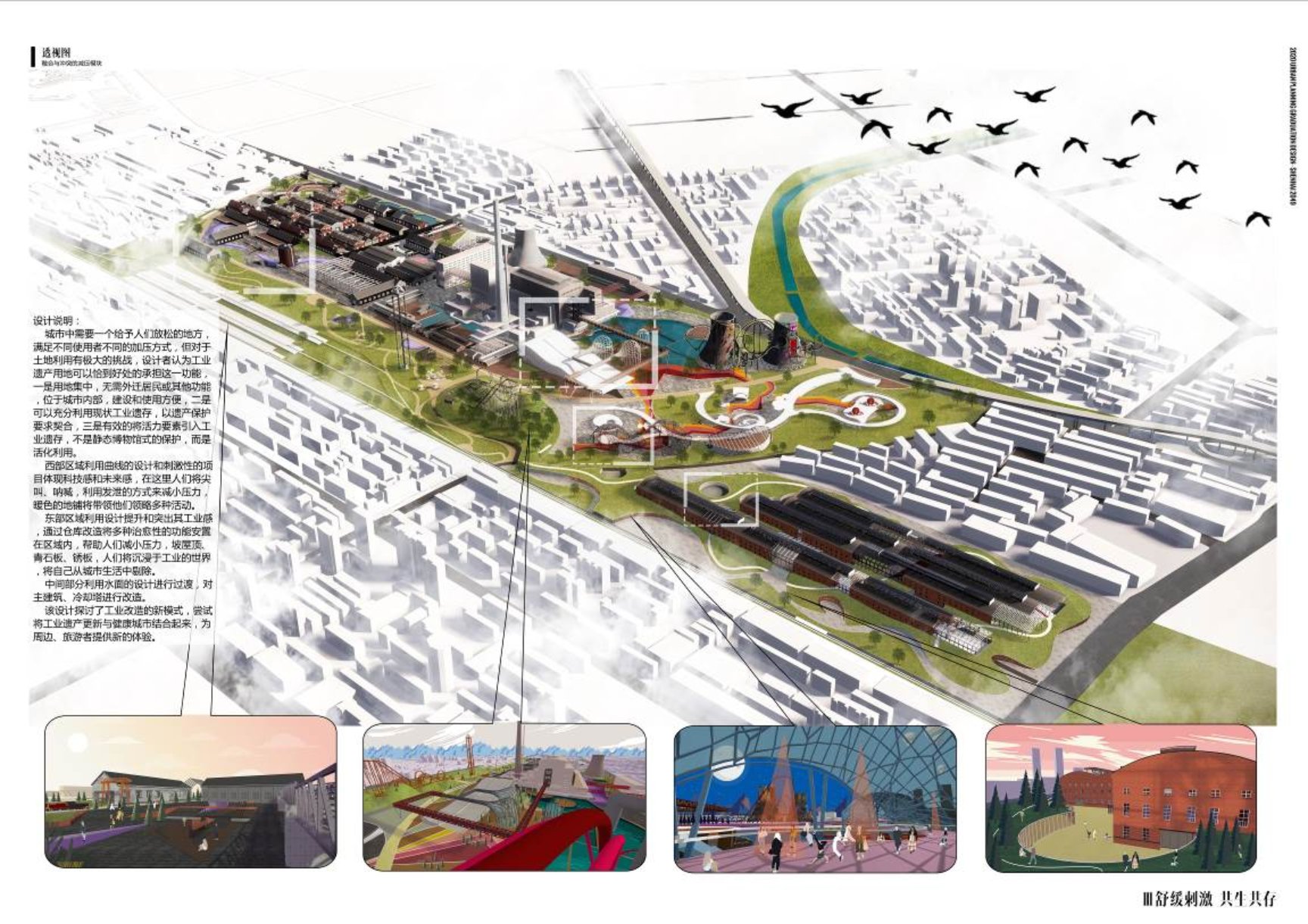 第二套方案提出要满足城市居民的心理需求,采用冲突与融合的设计理念,形成了曲面建筑的未来感与原有建筑的工业感的碰撞,以及刺激与舒缓的减压方式对比,通过设计将它们融合在一起,通过减压空间带来心理健康以及社会交往,实现塑造健康城市的目的。方案得到了北京清华同衡规划设计研究院张险峰总规划师,辽宁省城乡建设规划设计院有限责任公司王国庆总工的好评,认为同学们大胆的思考,是学习城市规划、建筑、景观难能可贵的一种思想,对于既有建筑改造利用的设计很有特色,目标很清晰,成果很完整。