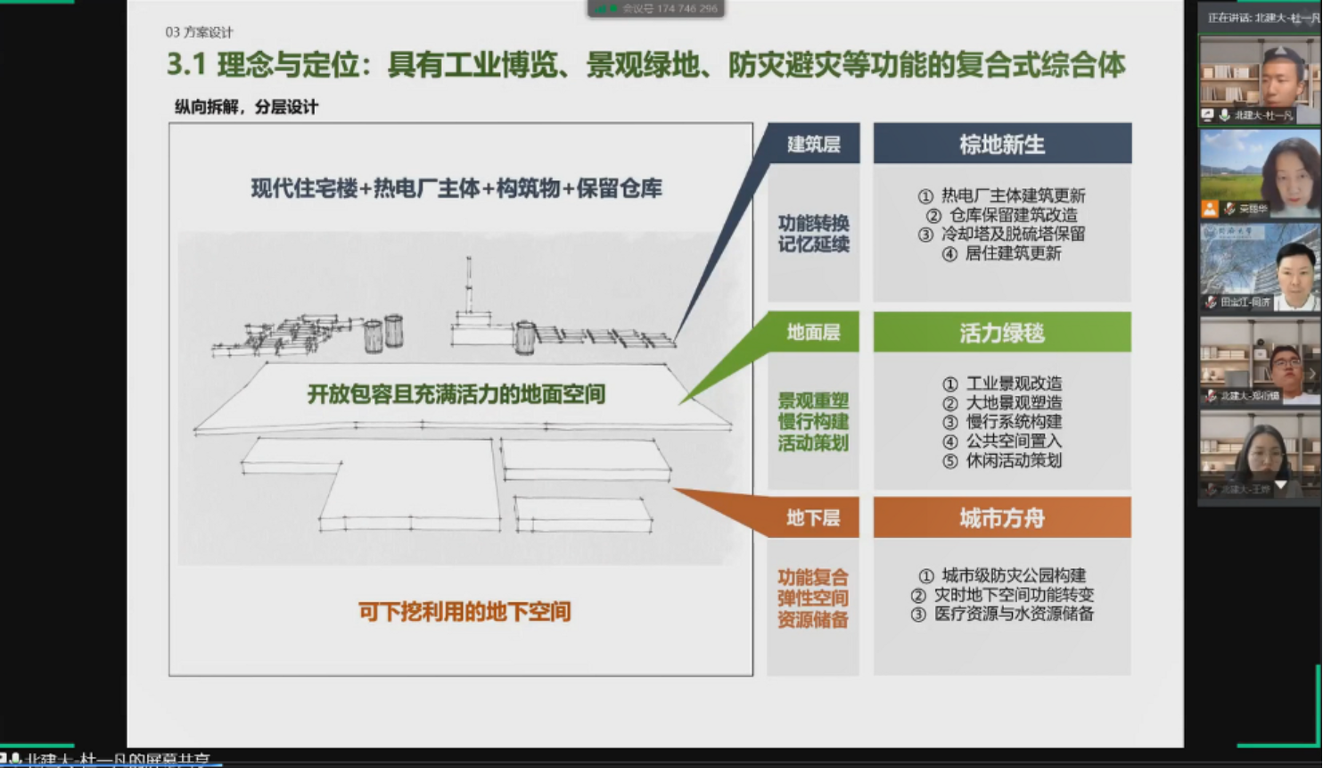 第一套方案提出了建立城市防灾模块的必要性,进而采用纵向拆解的手法,引出建筑层、地面层、地下层三个层次的空间设计策略,通过落实设计策略,为场地置入弹性化的功能空间,塑造了凸显工业遗存文化的整体形态,并对各分区进行了详细的建筑设计和场所营造。方案得到了天津大学曾鹏教授、同济大学田宝江副教授、沈阳自然资源局历史文化名城保护处武静宇处长的高度评价,认为方案大胆而有说服力的捕捉到城市问题,进行了系统的设计与研究。