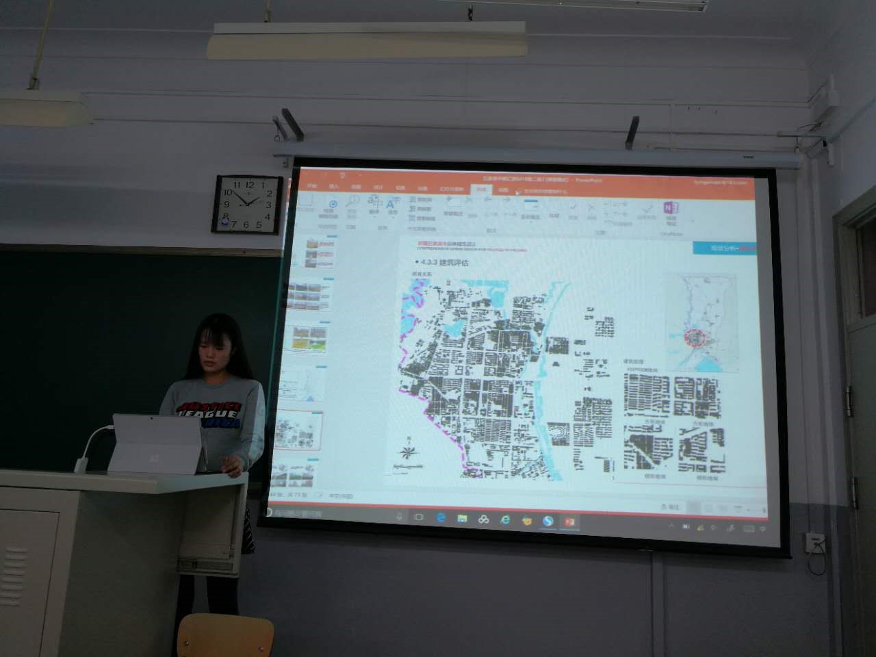 2017年4月18日下午,公司12级城乡规划专业毕业设计新疆五家渠市总体城市设计项目组中期检查在教1楼322教室举行。评审老师陈晓彤,王晶,陈闻喆,桑秋,指导教师荣玥芳和校外指导老师张云峰参加汇报。新疆五家渠市总体城市设计的汇报从背景研究,城市概况,城市定位和总体城市设计四个方面进行.设计小组调研充分,基础资料分析细致,汇报文件条理清晰,图纸成果深度达到中期汇报要求。