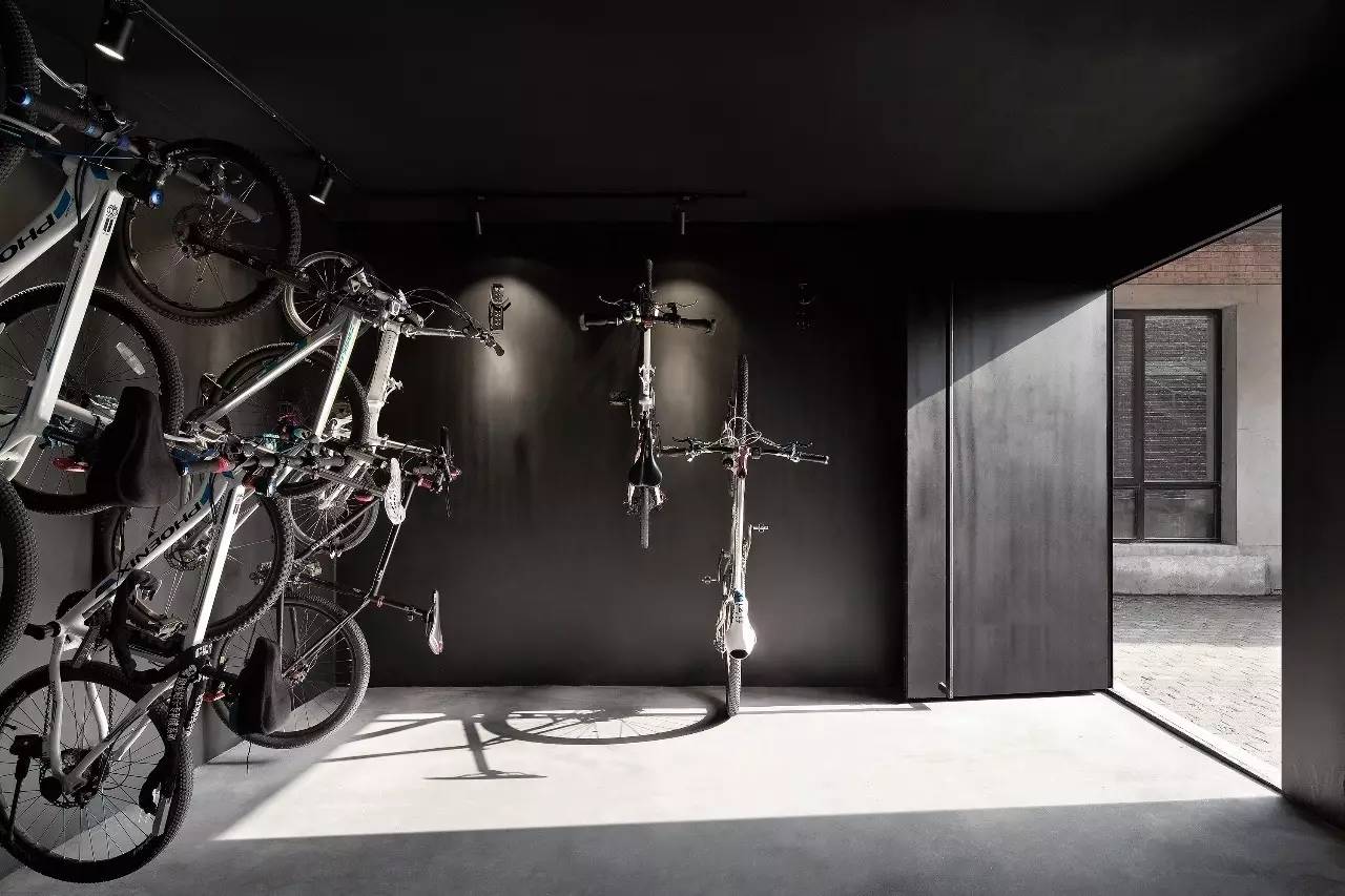 改造过后的主入口是一个盒式暗空间,除具门和雨棚的功能外还安装有悬挂自行车的装置,是为自行车爱好者们设计的特别福利。这个黑盒子与室内的主楼梯紧密联系并形成了一条主要交通动线。