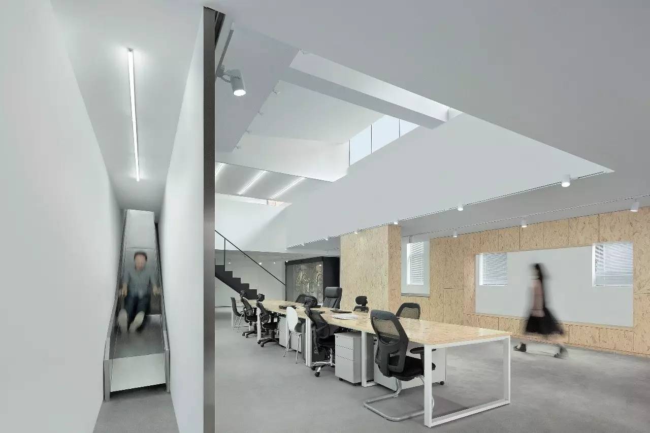 次入口位于建筑物西侧,与大阶梯相连,是员工进出的辅助线路。此外,一条“忍者通道”——隐藏在隔墙里的滑梯——可以让人快速从楼上到达楼下的洗手间和休息室,更丰富了室内垂直交通。