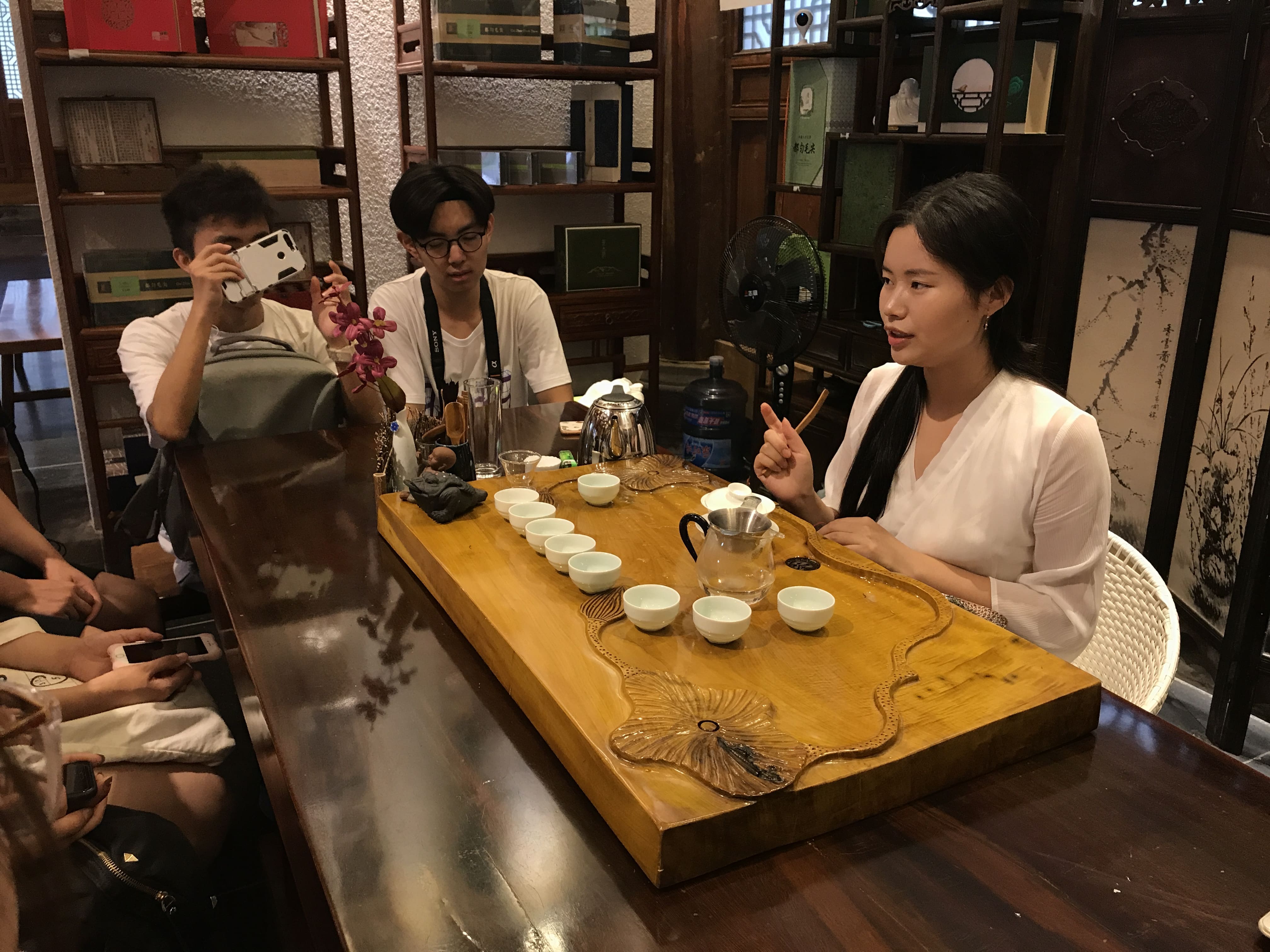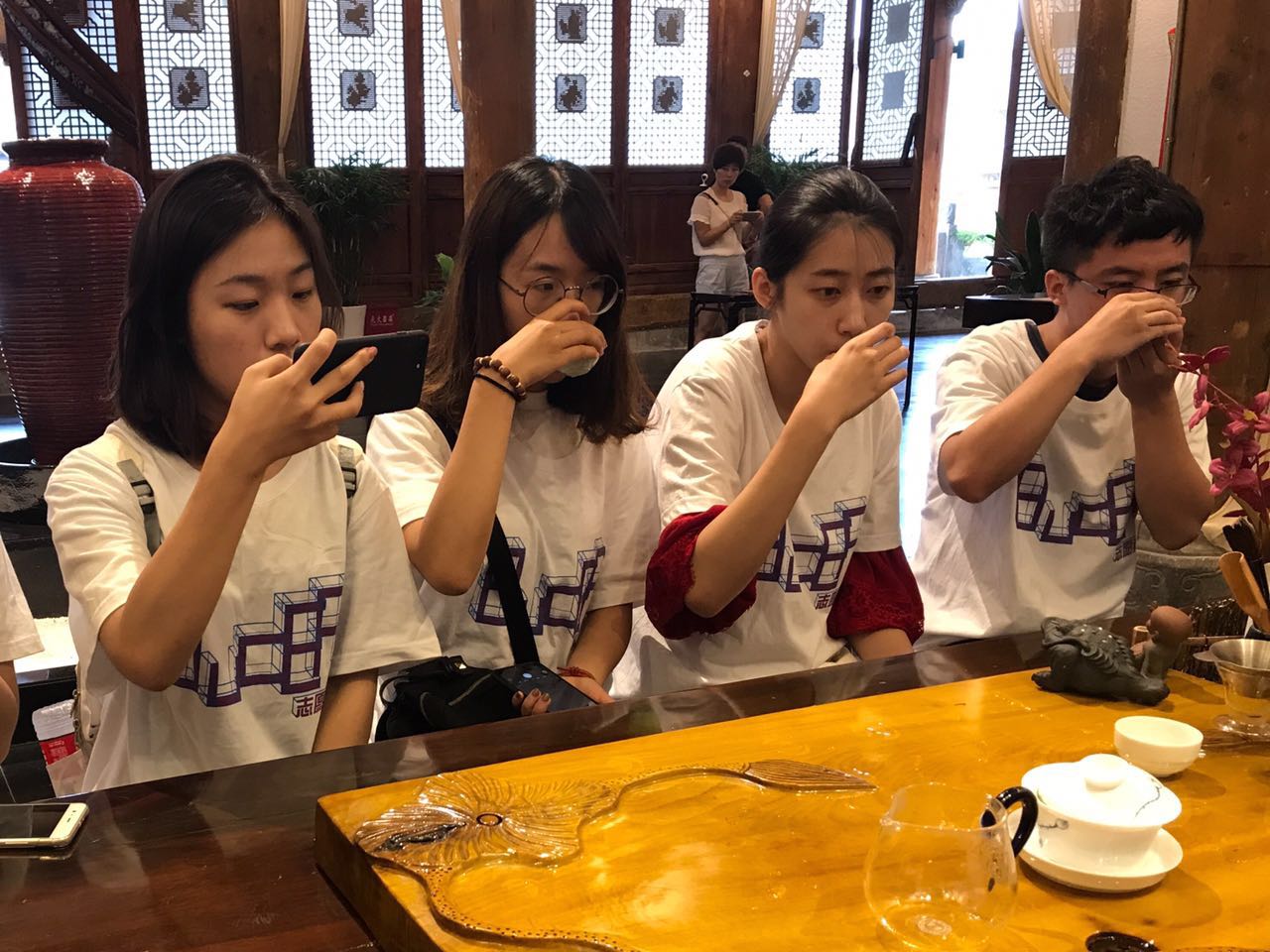 实践团成员在茶博园内茶艺师的带领下品茶认茶,并与茶艺师交谈,了解茶学文化。从认茶,沏茶,赏茶,闻茶,茶艺师像对待艺术品一样精心的将都匀毛尖的香气融进温热的水里,化作一盏香茗。实践团成员品味着毛尖的香味,更是品味着中国茶文化的韵味。在幽深抑扬的古琴声中,茶艺师为成员们讲解了茶学的基础知识,成员们也提出了与茶文化传承、建筑文化体验等相关的问题,茶艺师都一一为我们解答。从茶叶的种植到茶叶的加工制作,再到沏茶品茶,每一步都透着中华文化的韵味。