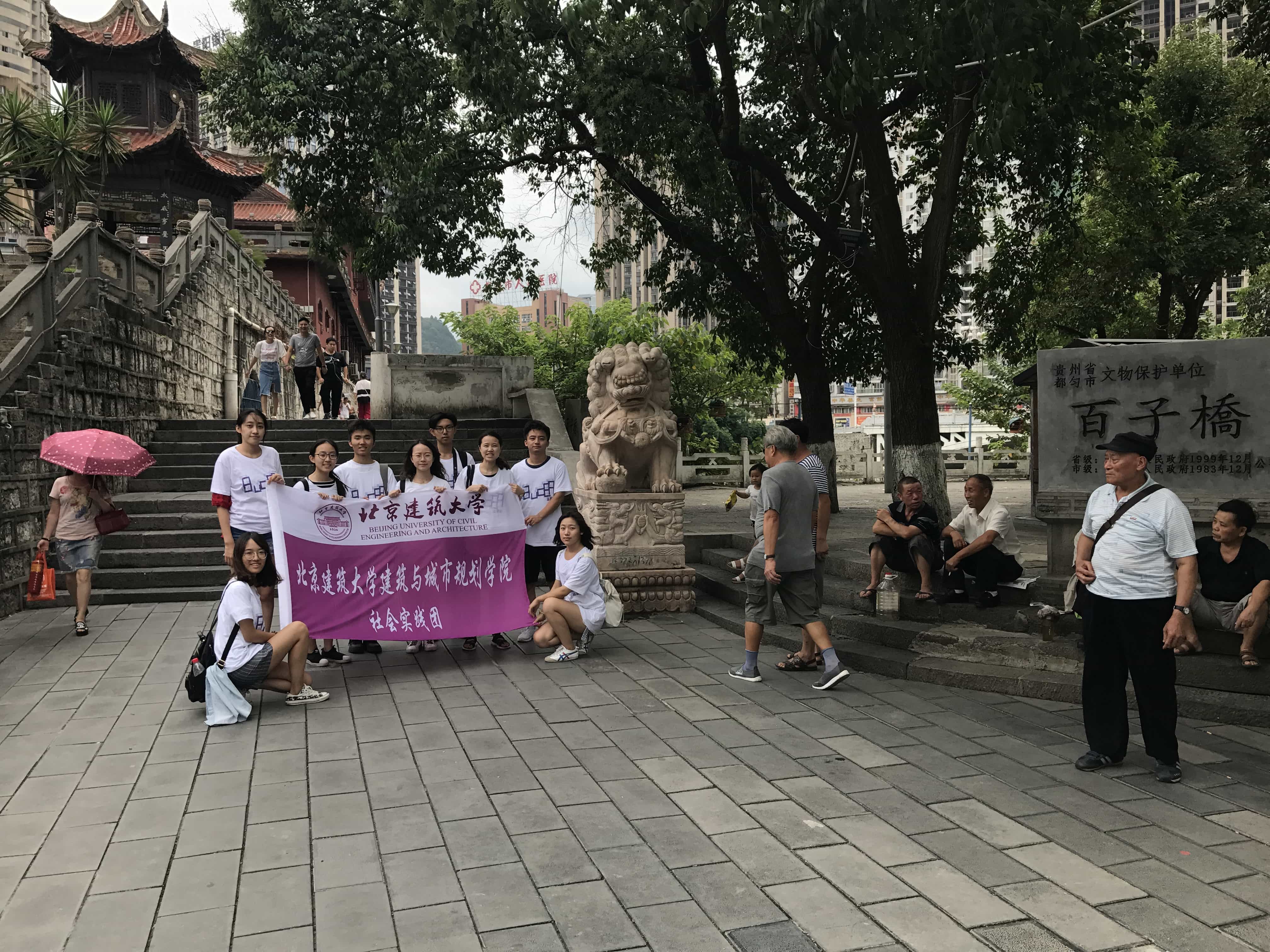 下午,实践团成员来到了百子桥,都匀有"高原桥城"之美誉,市区内有各种不同建筑风格的桥梁近100座,横跨在涵抱全城的剑江河上。一座座风格独具的桥梁,融古典情调与现代风格、宏宏大观与纤纤绢秀于一体,都匀因之被誉为"桥梁博物馆"。百子桥始建于1786年,该桥是都匀地区石拱桥的典范,也被贵州省列为省级文物保护单位。百子桥为风雨桥,就像一个长廊横跨剑江河上,桥上有市民在这里乘凉歇息,孩子嬉戏打闹的声音不时传来,仿佛看到百子桥跨越百年沧桑岿然不动立于河上为市民遮风避雨。