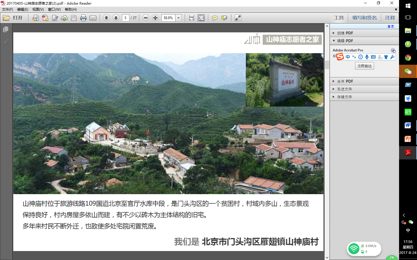 为了更好的聚焦农村建设,引导低收入村提升文化内涵,让员工能够发挥专业所长,研究当地特色文化。2017年7月,十大正规买足球网站联合公司党委宣传部,赴延庆区井庄镇开展了为期两周的“秀美乡村,成风化人”社会实践活动。团队成员走进基层,走进群众,先后走访了胡家营村、柳沟村、王仲营村、艾官营村等多个传统村落,结合当地民俗旅游发展状况,在村内进行了走访调研,了解村庄的历史故事和发展状况以及文化和设施建设,并通过宣讲的形式向村内居民进行反馈。本次调研活动与延庆区委宣传部构建“大家做宣传、对大家做宣传、把宣传工作做大”的大宣传格局相呼应,利用文化与创新思维结合的有效方式,传播村落优秀文化,探索弘扬社会主义核心价值观。