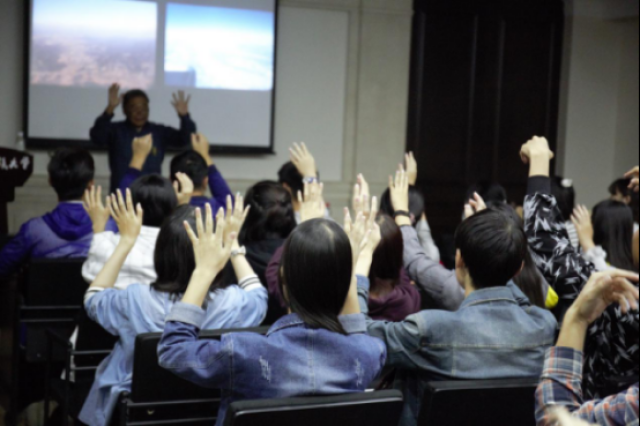丸山先生先让听众举起手在空中挥舞,让视线集中在双手上,进而阐述自己的观点:手是表达设计思想的工具,只有亲手触摸才能体会木材、竹子等传统材料的韵味,设计师应充分考虑人、自然、社会三者的关系。