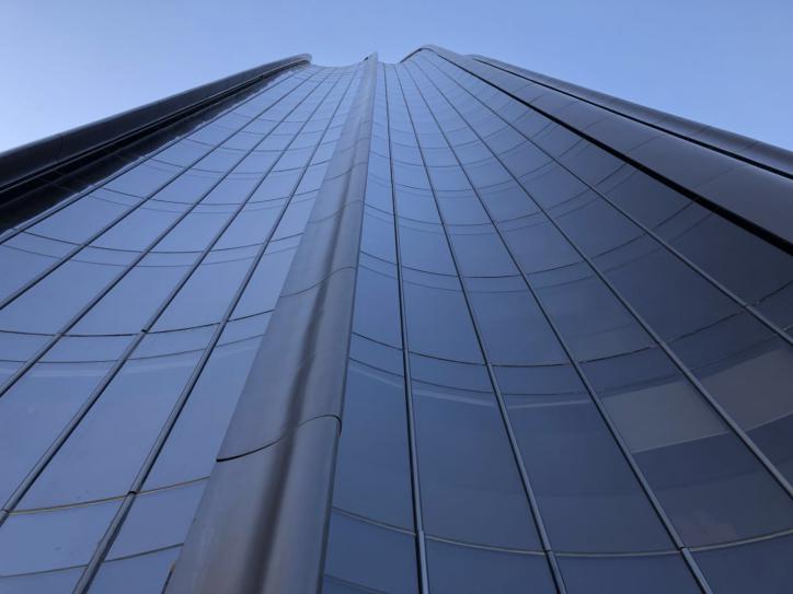 让我觉的十分震撼的就是两个很高的形如高山的建筑,在我接近时,我就觉得十分不同。一凹一凸,突出墙面的变化。凸的部分较为尖,而凹的部分较为平滑,像是几何中的多边形。凸的部分一直延伸到大楼的顶部。而一凸一凹形成了层使得大楼更像是一层一层通过拼接组合起来的。而且整体建筑使用的材料为玻璃,而且玻璃在不同层面里的角度是不一样的,人从外面看是照出的像是不规则的。从颜色方面来开,整体玻璃和凸出的部分选用的颜色为黑色和灰色,给人一种高贵,沉稳的感觉。进入内部却是完全相反的世界。内部则是以古铜色为主色调,搭配用暖色光给人舒适。而且建筑为两部分连接组成,两边使用的是黑色玻璃,而中间的大厅则使用的是透明玻璃使得从外面可以直接看清楚内部。这种暗与明的对比突出了入口和周围的不同。进入大厅,向上看。太阳光将大厅整个点亮,而大厅的屋顶玻璃如波浪般分布,总共有两起两落。而且中间好像船的龙骨给人无限遐想。室内装饰也是偏古代风格:原石一样的椅子,假山,修剪过的盆栽使这个环境更加富有活力。通过大厅则是到了被群山样的建筑环绕的园子。同样的,在园子里看清大厅内,大厅里的人也可以望向园子。