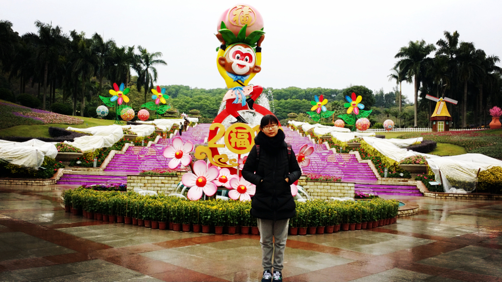 东侧在种植各种花卉的同时,还依地势起伏培植了大面积的草坪,远远望去,酷似一条绿色的瀑布。遗憾的是,我游览云台花园时,正值冬季,很多植被都蒙上了白布进行保温,没有看到花海般的场景。西侧是谊园和茶室。谊园中心是一巨大地球石雕,以地球石雕为圆心,在一个巨大的圆周内,分布着已与广州结为友好城市的市花和友好城市所在国的国花。