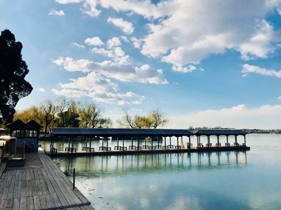 湖泊、峰峦、烟柳、塔影,相映成趣,古代造园家们,采用了借景的手法,将数十里开外的重峦叠嶂的西山、林木青葱的玉泉山、半山腰屹立着的玉峰塔,以及园中的一景一物,分别作为远中近三景,自然与人工相契融合,形成一幅美丽的画卷。与深秋的昆明湖不同的是如今的昆明湖已结上厚厚的冰,大人、小孩儿在冰面上嬉戏打闹,好不热闹。电视剧《甄嬛传》中,安陵容的冰舞的窈窕身姿,使我想起了故宫博物院里收藏的由乾隆年间宫廷画家张为邦、姚文翰所绘的展现宫中冰嬉的《冰嬉图》,或许当年也同今朝一般热闹。在这堆砌的美景之中,使我记忆最为深刻的,不是昆明湖的美景如画,而是湖前随意点下的树。不同于现代规规矩矩地按照行距种树,而是还原自然,顺其自然,树木有疏有密,甚是有趣。“极目所至,俗则屏之,嘉则收之”。