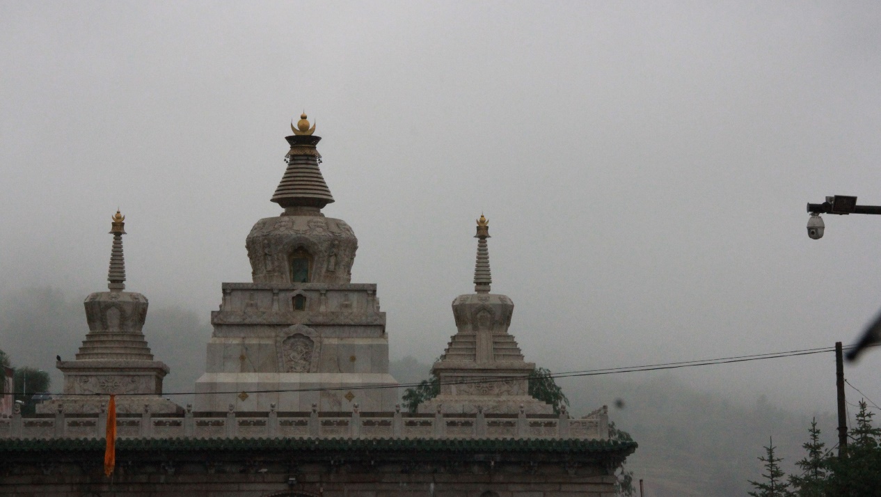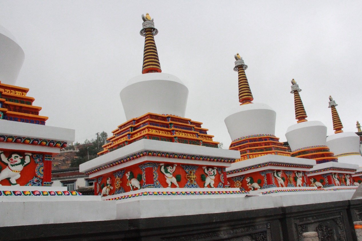 说不上是幸运还是遗憾,我们恰巧赶上了小雨。淅沥的细雨落在海拔3000米的寺前广场上,伴随着远处男孩叫卖青稞的吆喝,我终于看清了塔尔寺的全貌。期待中的佛寺,是在青石走道的约束下,精心规划对称排开的几大朱色楼阁。但眼前这群建筑,更像是一个依在莲花山脚下的精致村落。东北高地上的几行藏式平顶建筑是喇嘛们的住处。以僧舍为背景,从西南至东北又是一个略缓的下坡。平顶与飞檐一路交错,放射状围着北边的山排列到低地。复杂的藏红与简单的白色铺满了建筑,些许金色点缀在屋顶,最后,八座如意塔坐镇在入口。即使从相反的方向来看这寺院,也有着不俗的情调。