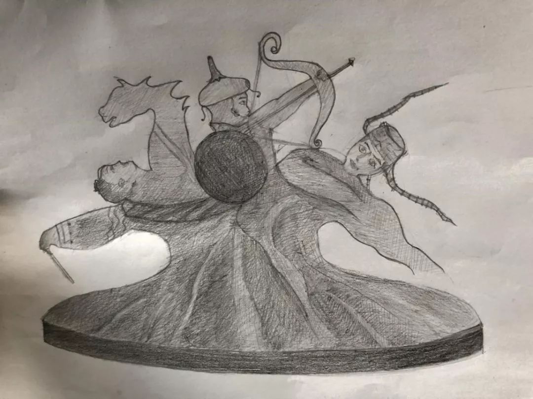 画中细节看左边为跳长鼓舞的朝鲜族姑娘,右边是舞动的维吾尔族姑娘,上面是拉弓射箭的蒙古族青年。维吾尔族、蒙古族、朝鲜族分别是守卫中国北方雪原西部、北部、东部的三个民族,他们是北方雪原的守护神。画中朝鲜族姑娘的袖子化为马头,另一只袖子和长鼓棒组成了马的前蹄,维吾尔族姑娘的袖子化为马的后蹄,画的整体来看就是一匹骏马,他们如奔腾的马儿,是雪原的英雄、民族的灵魂!
