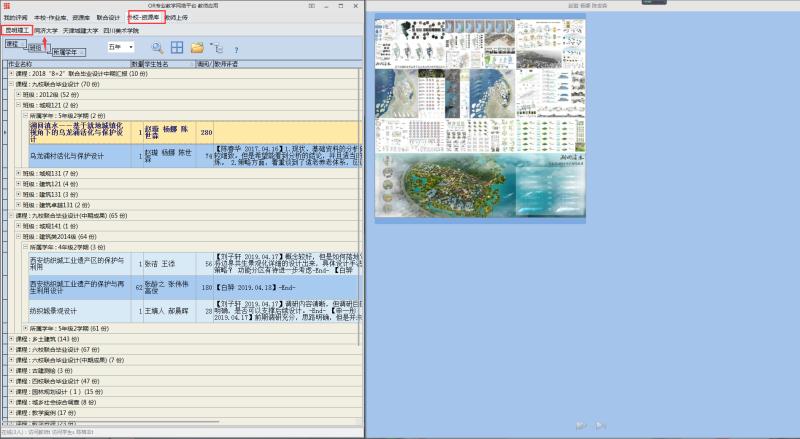 目前OR专业教学网络平台系统在刘志刚老师统筹下,资料室陈格非老师结合公司现有数据资源,在昆明理工大学吴浩老师技术支持下,以公司本科建14级、规14级、研究生16级设计课程为基础,重点搭建并实现了员工快速上传作业、教师网上批改作业、评图、上传教学资源,以及师生快速查找作业,向师生开放的作业库。在校际合作协议签约的情况下,师生图上交流、调阅其他院校的作业大数据等多重功能。