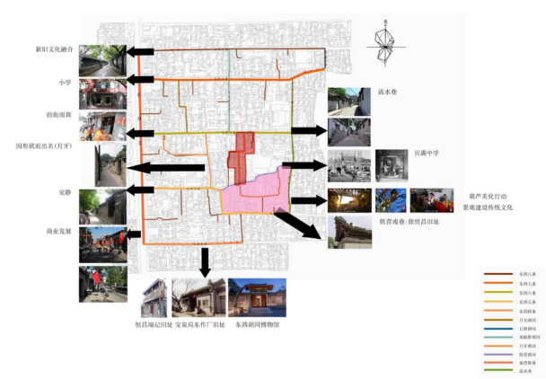 如何破解这个难题呢?陈老师想到了将研究生教学中的文献研究环节引入本科教学,在本科教学中增加文献研究的分量,鼓励同学们从影像资料、网络咨询(博客)、书籍、硕博论文、期刊文献等入手,尽可能收集与设计场地“东四地区”有关的资讯,弥补现场踏勘缺失的教学不足。同时借助文献研究提升对同学收集资料、分析整理资料和总结归纳资料等分析归纳能力的培养,提高同学们在设计过程中的思辨能力和研究能力。