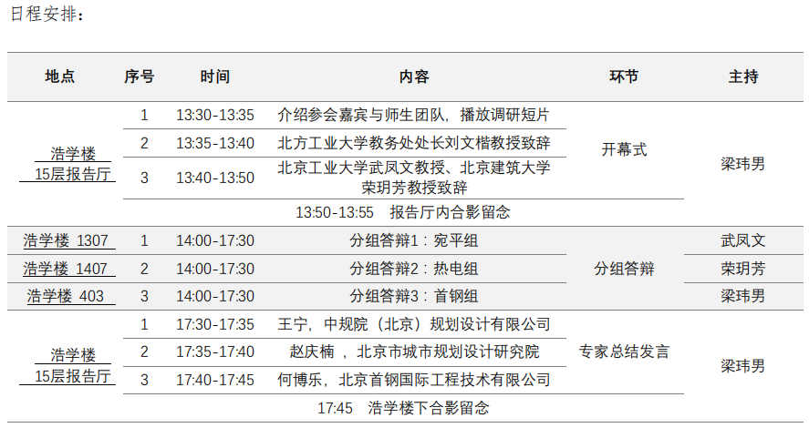 首先,北方工业大学刘文楷处长对参加此次答辩的专家、各公司的师生团队表示了欢迎,强调了京津冀高校联合毕设是在京津冀协同发展的指导下进行的高校多元合作,对京津冀高等公司的发展做出了贡献。之后,北京工业大学武凤文教授表达了对中国城市规划学会和其他各地学会的支持表示感谢,回顾了京津冀联合毕设的开设初衷、发展历史,最后,十大正规买足球网站荣玥芳教授提出:本次联合毕设是由三校联合举办、多主体参加,对未来大家参与到北京更新规划建设表示期待并预告了终期答辩时间安排等事宜。