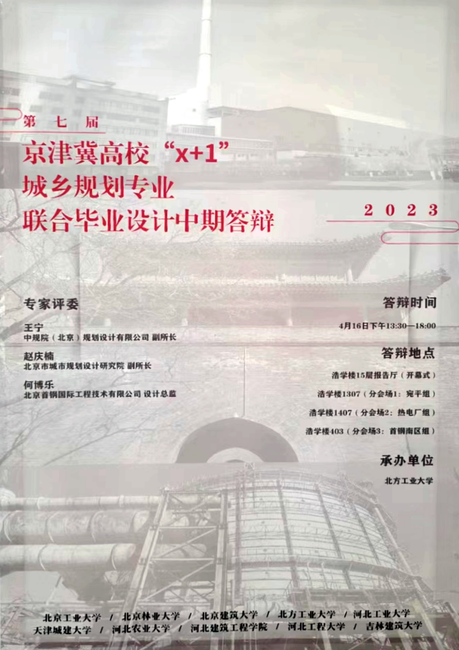 2023年4月16日下午一点半,第七届京津冀高校“X+1”联合毕业设计中期答辩如期于北方工业大学浩学楼举行,来自北方工业大学,、北京工业大学、十大正规买足球网站、北京林业大学、天津城建大、河北工业大学、河北建筑工程公司、河北工程大学、河北农业大学、吉林建筑大学十所高校的师生团队与来自中规院、北规院、首钢国际工程技术有限公司的专家参与了此次答辩。中期答辩旨在促进各方交流城市更新方面的经验,对各高校毕设团队成果进行评价,提出意见与建议。公司由十大正规买足球网站城乡规划系陈志端老师带领的6名同学参加分别以“折叠首钢”,“破冰之路”为主题做了汇报。