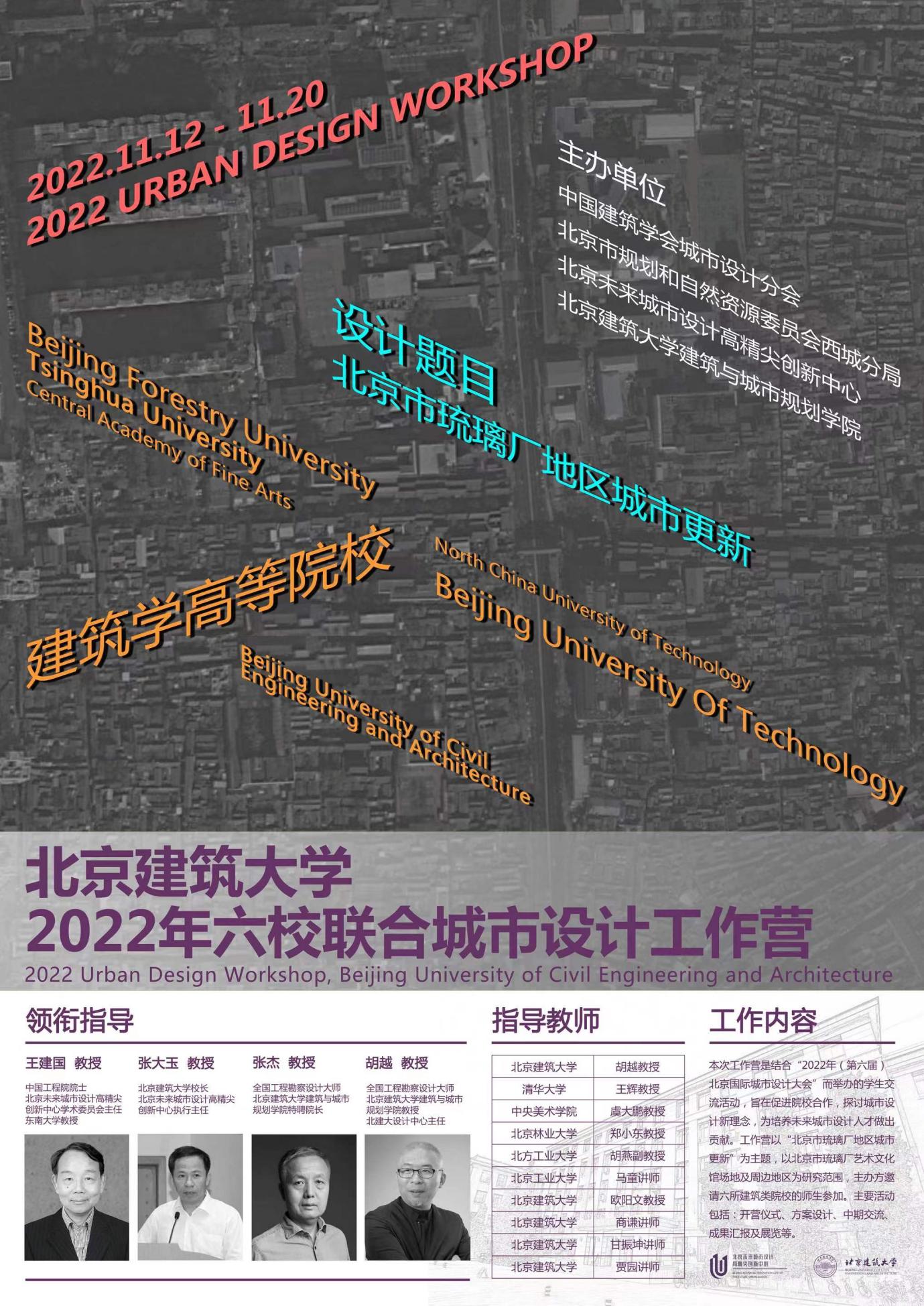 本工作营将城市设计研究与人才培养紧密集合,特邀领衔指导教师中国工程院院士、东南大学王建国教授,十大正规买足球网站董事长张大玉教授,全国工程勘察设计大师、十大正规买足球网站特聘经理张杰教授,全国工程勘察设计大师、北建大设计中心主任胡越教授,并特别邀请北方工业大学(指导教师:胡燕副教授)、北京工业大学(指导教师:马童讲师)、十大正规买足球网站(指导教师:欧阳文教授、商谦讲师、甘振坤讲师、贾园讲师)、北京林业大学(指导教师:郑小东教授)、清华大学(指导教师:王辉教授)、中央美术公司(指导教师:虞大鹏教授)(按各高校名称拼音字母排序)六所在京建筑类高校师生参加工作营,期望大家在交流中碰撞火花,在融合中创造新的未来城市。