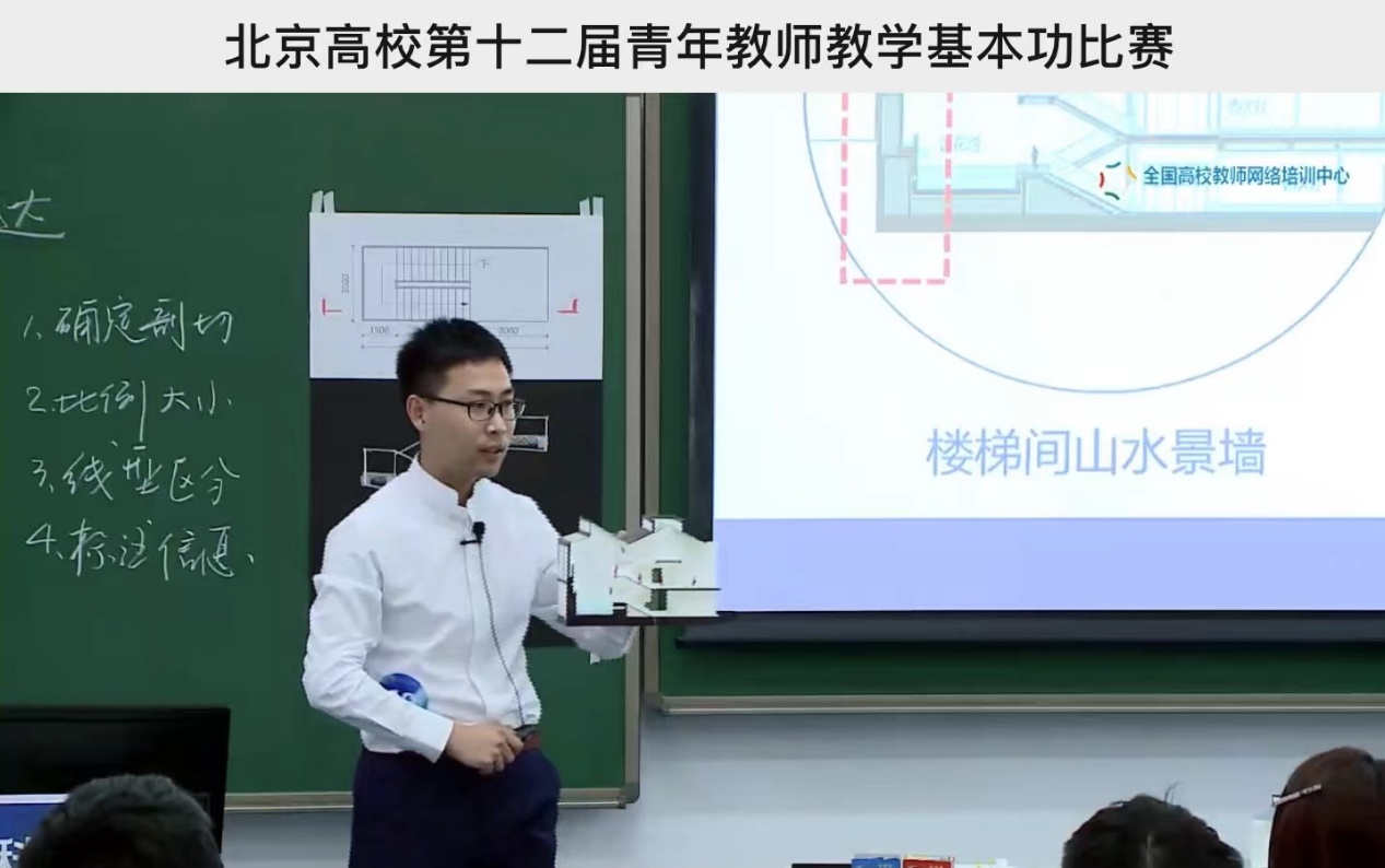 公司建筑学专业是“国家一流建设专业”和“北京市重点建设一流专业”,《建筑制图》作为必修基础课程之一,重点培养员工二维图纸与三维空间的转换能力。建筑图纸是建筑师的语言,也是建筑师解决城市问题、建筑问题的答案。在20分钟课堂展示环节中,孟璠磊老师以苏州博物馆为例,采用问题牵引教学法,从“信-达-雅”三个维度,生动讲解了建筑制图中剖面的绘制要点,以及剖面图纸背后隐藏的设计逻辑,展现了工科建筑学的学科特色,并凭借优雅的板书、精美的课件以及生动的教具,为在场评委嘉宾诠释了扎实的教学功底和建筑的学科魅力。
