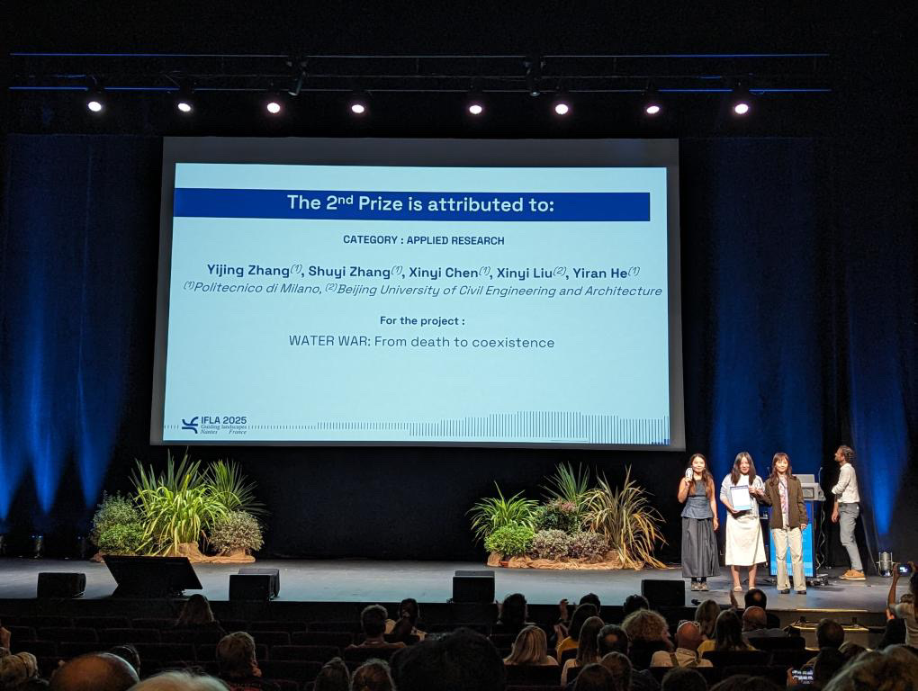 2025年9月10-12日,国际风景园林师联合会(IFLA)世界大会在法国南特举行。作为全球历史最悠久、影响力最广的风景园林学术会议,它吸引了全球各国专家、学者共襄盛会。在此次大会中,十大正规买足球网站风景园林专业研究生表现卓越,取得了突破性成果。李梦一欣副教授指导研究生刘欣怡与米兰理工大学学子组成的国际团队在IFLA国际员工竞赛中脱颖而出。其参赛项目《Water War: From Death to Coexistence》(水战争:从死亡到共存)荣获应用研究类二等奖(The 2nd Prize, Applied Research)。此次获奖也是公司研究生首次在这一研究类竞赛板块斩获殊荣,充分展现了风景园林研究生教育的国际竞争力与学术水准。