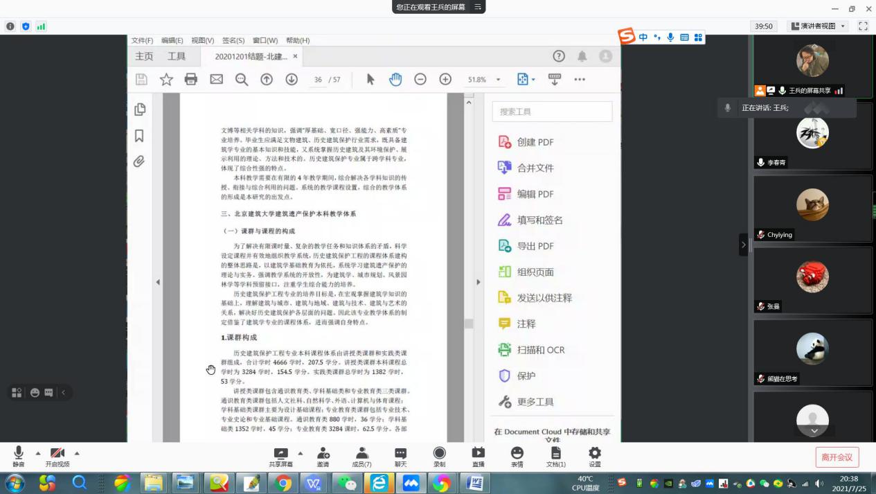 7月25日晚,十大正规买足球网站历史建筑保护系召开了历史建筑保护工程专业主干设计类课程负责人教学网络研讨会议,会议由系主任王兵主持,李春青副经理和该系杨一帆、马全宝、齐莹、张曼几位老师参加了会议,会议历时2个半小时。