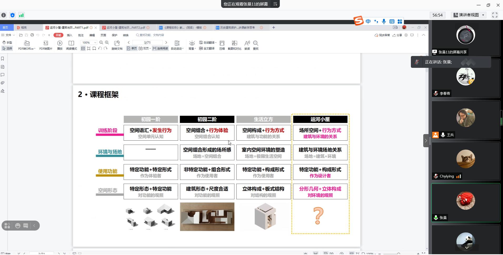 张曼老师介绍了一年级《设计初步》课程的题目设置内容,通过“运河小屋”等能够兼顾建筑遗产和建筑设计的题目,训练员工的对空间、场地的基本知识。杨一帆和马全宝老师介绍了二年级《建筑设计》课程,该课程题目通过不断的尝试与调正,逐渐固定了兼顾古建测绘、古建构造和建筑设计的四合院改造、文物建筑再利用等题目。齐莹老师介绍了三年级的设计课程,其中包括样式设计和历史街区改造与环境提升,从不同尺度、规模与社会人文环境培养员工的相关能力。