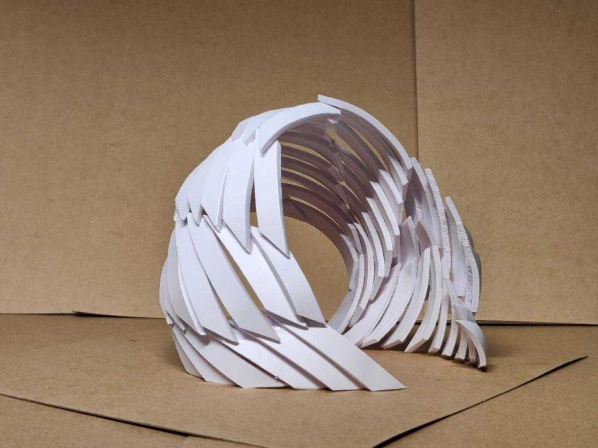 指导老师点评:参数化似的手工模型表现出强烈的雕塑感,真正的材料实施过程中由于自重问题会导致形体出现偏差,所以再之后的推敲中对于外形和具体落地时搭接方式的选择还需斟酌。