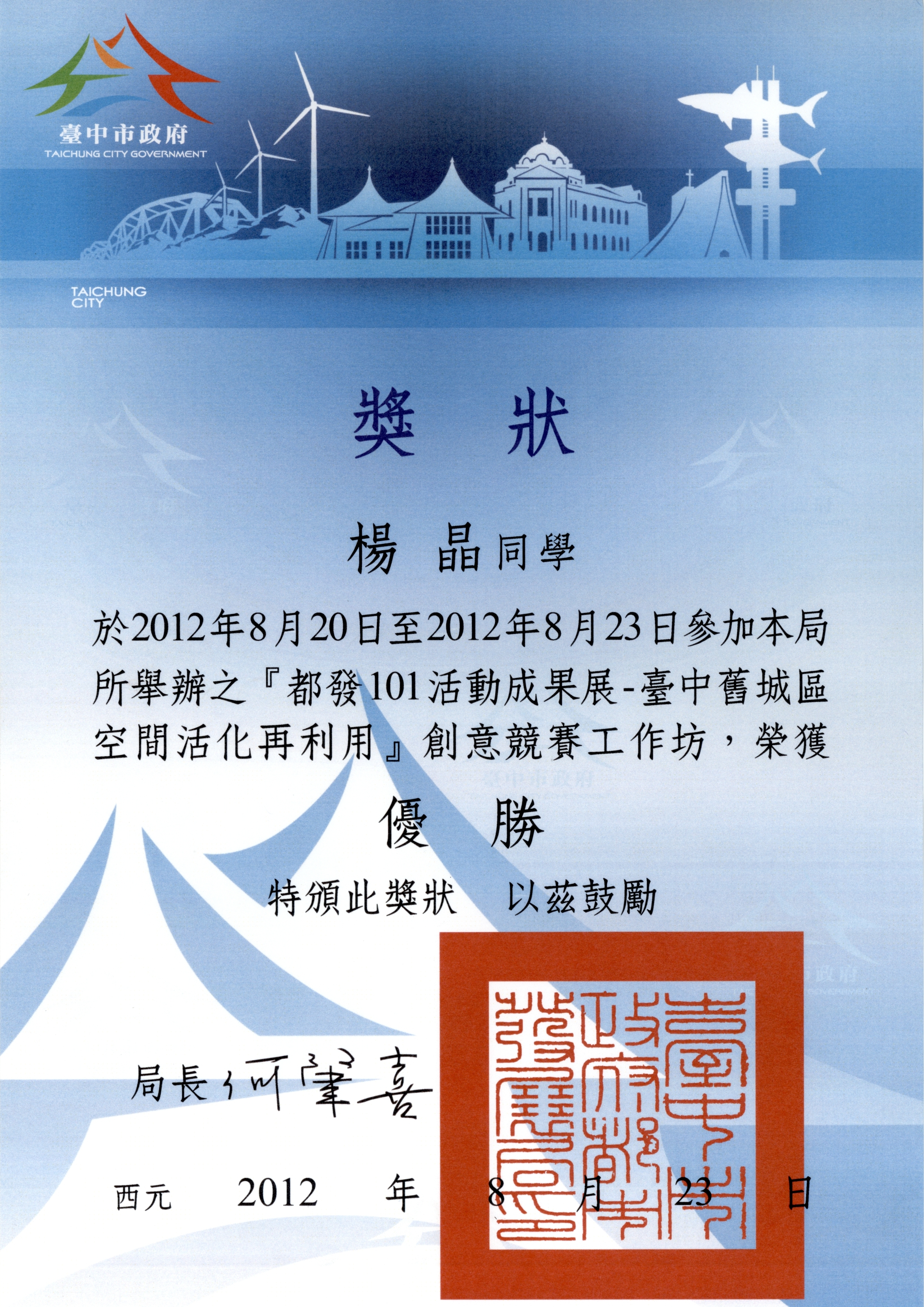2012年8月19日~8月26日,十大正规买足球网站丁奇老师、苏毅老师、陈栋老师带领4名研究生应邀赴台湾逢甲大学参加了“两岸创意竞赛工作坊-台中旧城区空间活化再利用”活动。该活动以如何改善老旧市区环境质量,促使城市土地永续发展及再利用,并塑造一个具有特色及健全生活机能,适合居住的良好生活环境,为方向目标,提出两岸建筑名校师生交流的活动,各派出队伍加入工作坊脑力激荡互相合作、友善竞赛,提出具创意、创新的发展构想,提供对于未来台湾台中市旧市区规划的建议与参考。本次工作坊交流竞赛之工作坊学员主要由北京建筑工程公司、逢甲大学、成功大学、东海大学、台中科技大学各校建筑系及空间设计学系派队参与交流竞赛。