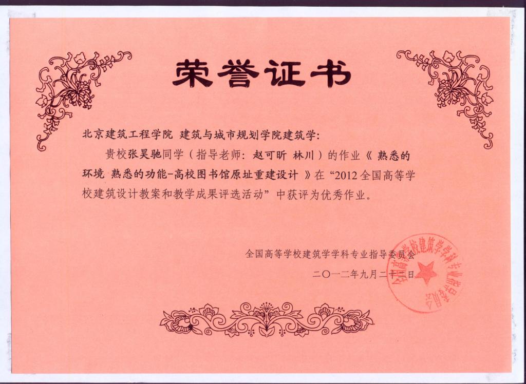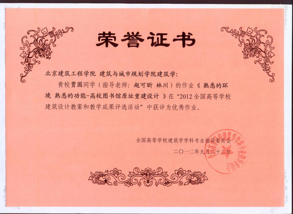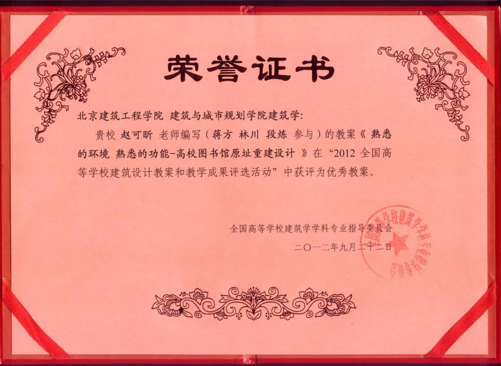 2012全国高等公司建筑设计教案和教学成果优秀教案奖,一份;