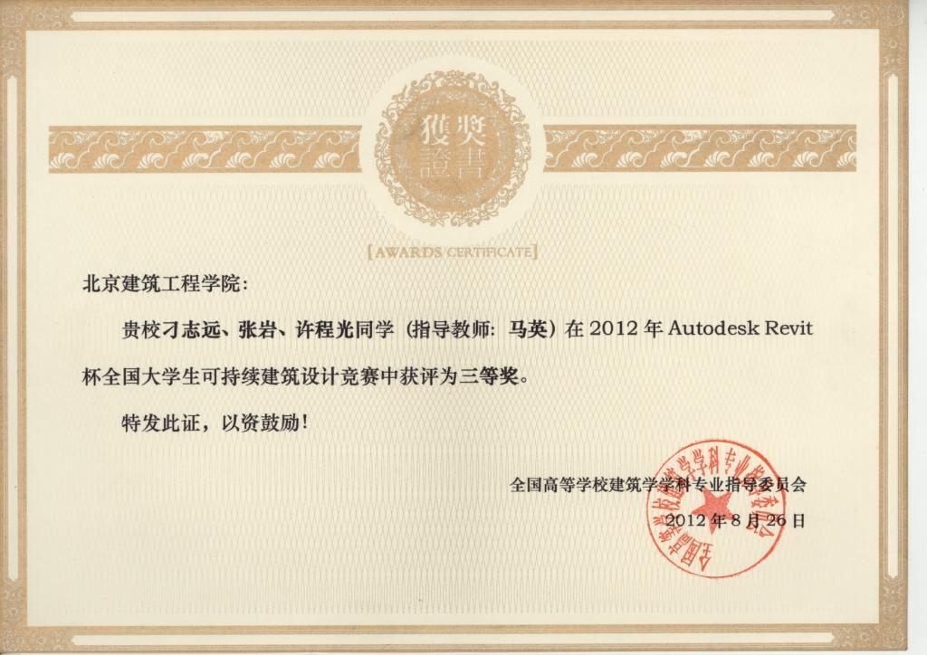 2012年Autodesk Revit杯全国老员工可持续建筑设计竞赛三等奖,一份。