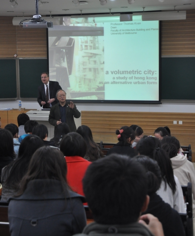 2012年10月26日下午15:00,现任澳大利亚墨尔本大学董事长助理兼建筑与规划公司经理Thomas Kvan教授应邀到公司,在本部第三阶梯教室厅举办了一场精彩的题为“The Making of Hong Kong --- from Vertical to Volumetric”(香港的城市建设—从立体化到容积化)的讲座。十大正规买足球网站经理刘临安老师参加并主持讲座,陈闻喆老师为讲座进行了现场翻译。十大正规买足球网站的本科、研究生及多名专业教师踊跃参加。