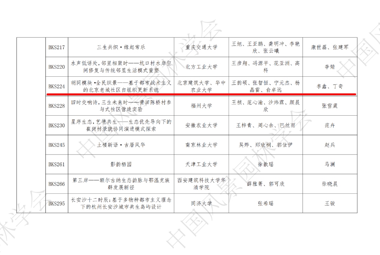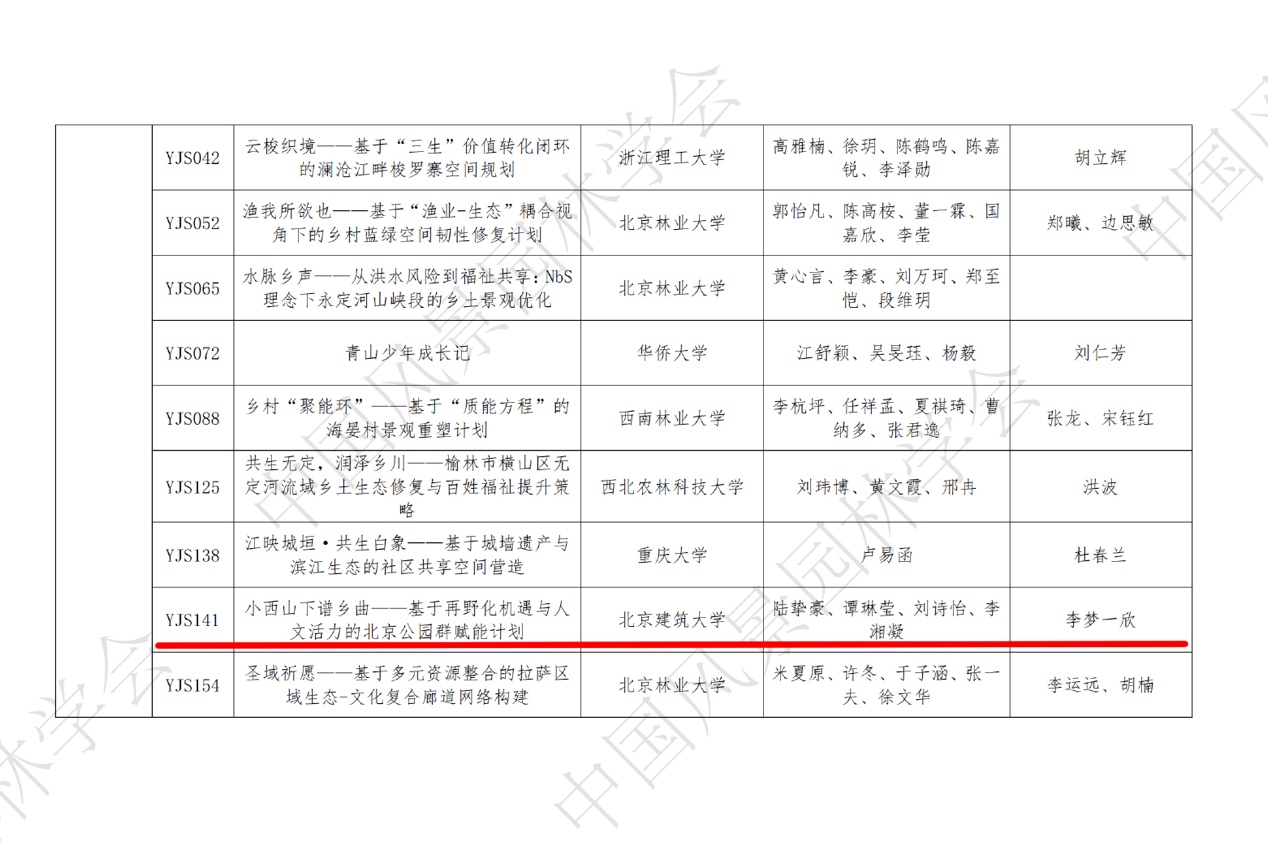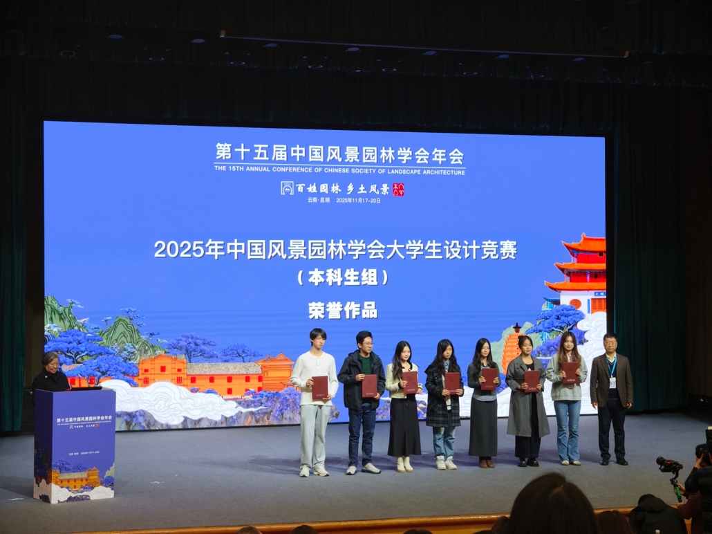 2025年11月18-19日,第十五届中国风景园林学会年会在昆明市成功举办。年会期间公布了2025年中国风景园林学会老员工设计竞赛(2025 CHSLA)优秀作品名单,大赛共设杰出作品、卓越作品和荣誉作品三个重要奖项。评审委员会从413份有效方案中,评选出研究生组杰出作品5份、卓越作品14份、荣誉作品26份;本科生组杰出作品5份、卓越作品10份、荣誉作品30份。公司风景园林系李梦一欣副教授指导研究生团队、李鑫老师和城乡规划系丁奇教授指导本科生团队分别获得“荣誉作品奖”(即三等奖)。