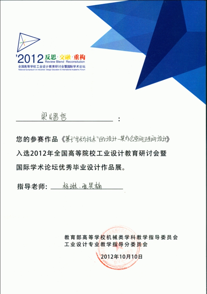 公司2012届工业设计专业毕业生黄庭晚同学的《基于“生活”的设计—卫浴空间及产品系统设计与研究》、梁熠哲同学的《基于“艺术与技术”的设计—某办公空间卫生间设计》、关迪同学的《酒架设计》与《餐具架设计》、丁洁同学的《家庭厨房刀具及其收纳设计》、齐飞、蒋艺、田丰庆同学的《北京公交标准车辆改造设计》等共6件毕业设计作品入选2012年“全国高等院校工业设计教育研讨会暨国际学术论坛优秀毕业设计作品展”。