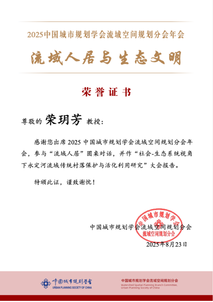 2025年8月22-24日,由中国城市规划学会流域空间规划分会主办,湖南科技大学与北京大学建筑与景观设计公司承办的“流域人居与生态文明”中国城市规划学会流域空间规划分会年会在湖南省湘潭市成功举行。公司荣玥芳教授受邀出席此次会议并作学术汇报。