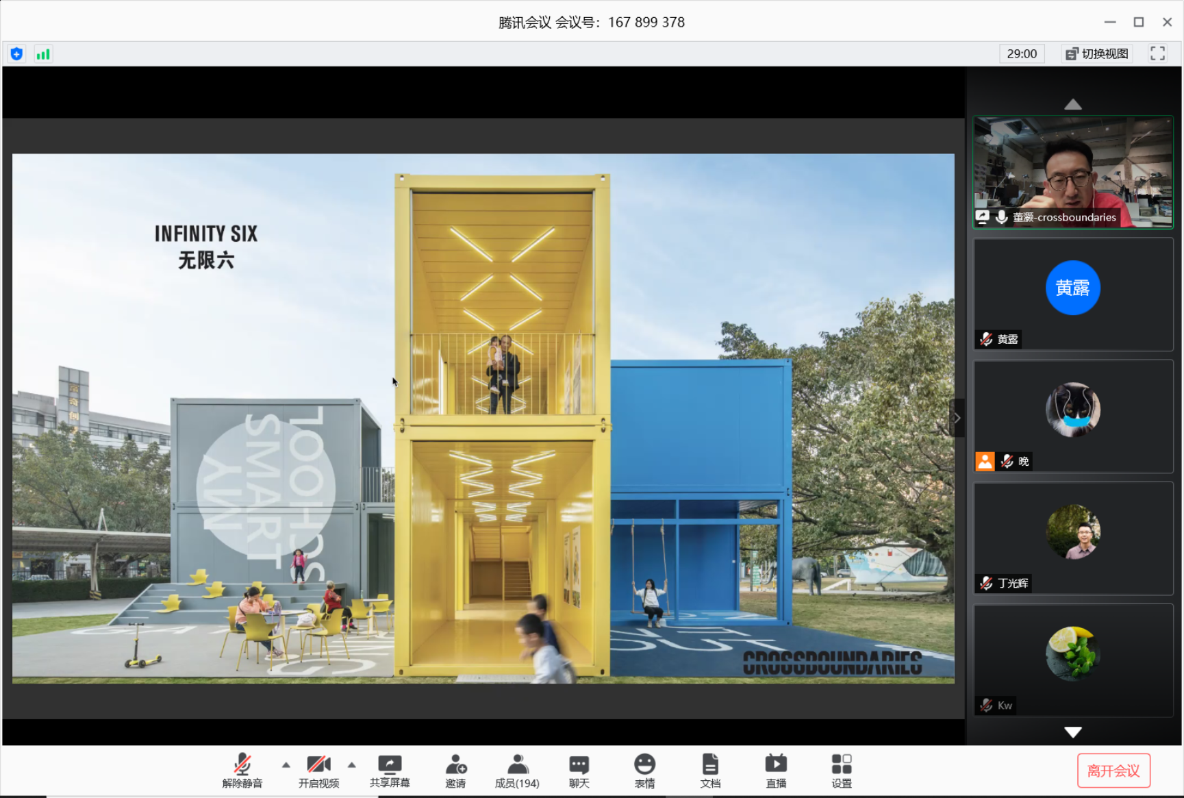 董灏回顾了其多个阶段的实践作品,从理念思考、方案生成、材料构造等方面,向线上听众阐述他对“建筑与城市”“客户与社区”的理解,同时对员工听众提出“搭建从学习到实践、从社会需求到人际交往间的桥梁,从而让设计更好的服务使用者”等期望。在自由提问阶段,同学们踊跃发言,提出关于幼儿园设计特点、建筑的形式选择、建筑评价等问题,董老师逐一详细解答。