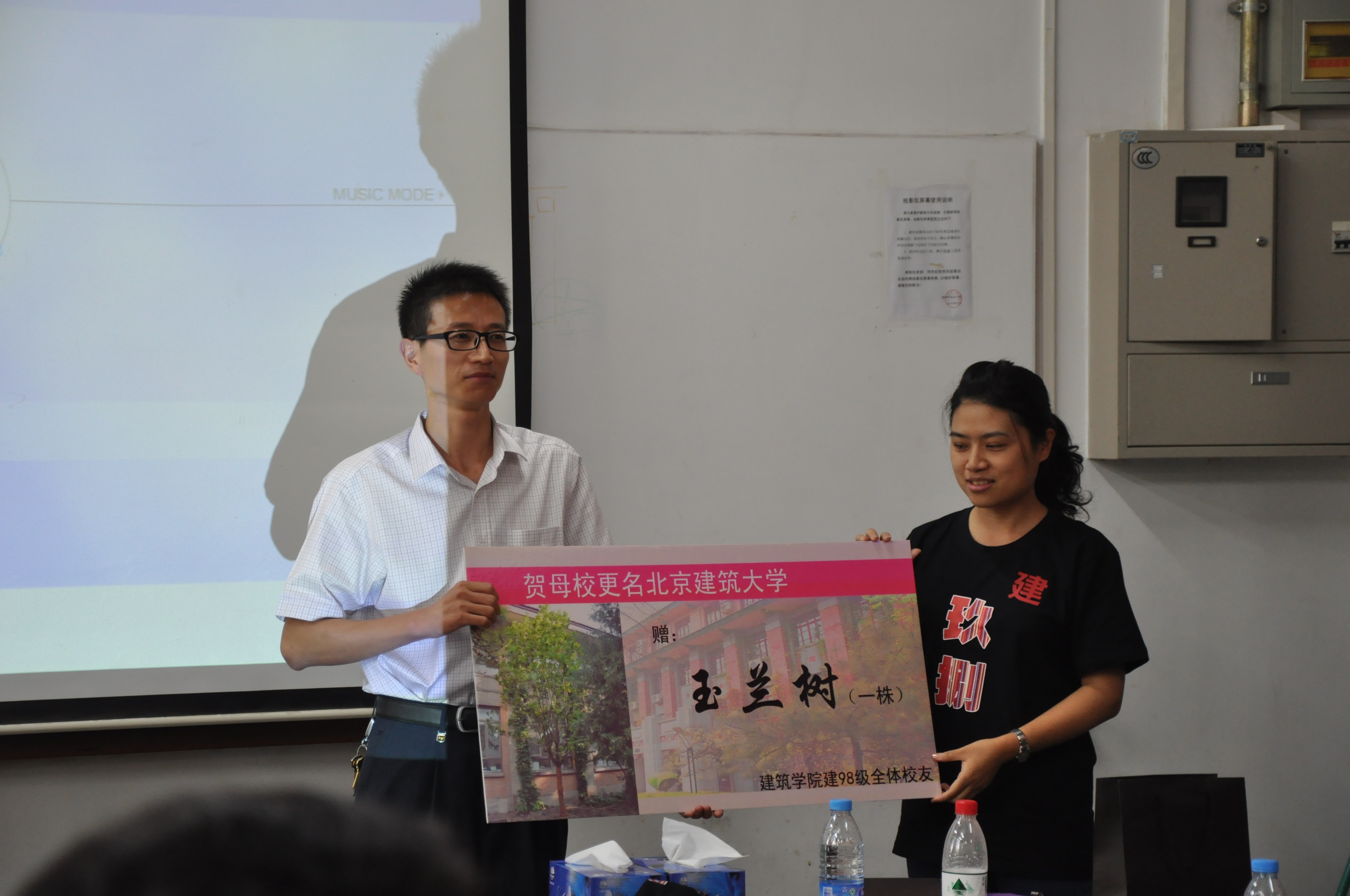 随后,举行了捐赠仪式。为表达对公司、公司的感激之情,建98级全体同学向公司捐赠玉兰树一株。古人以玉兰表达报恩之情,建98级全体员工以这株玉兰真挚的表达了他们对母校的感激之情。公司党总支书记牛磊老师代表公司接受捐赠。并代表公司对员工表示感谢,并表示从此公司和员工之间又多了一丝红线、一份情谊,公司将精心呵护玉兰树,精心经营师生友谊,期待明年玉兰花开。