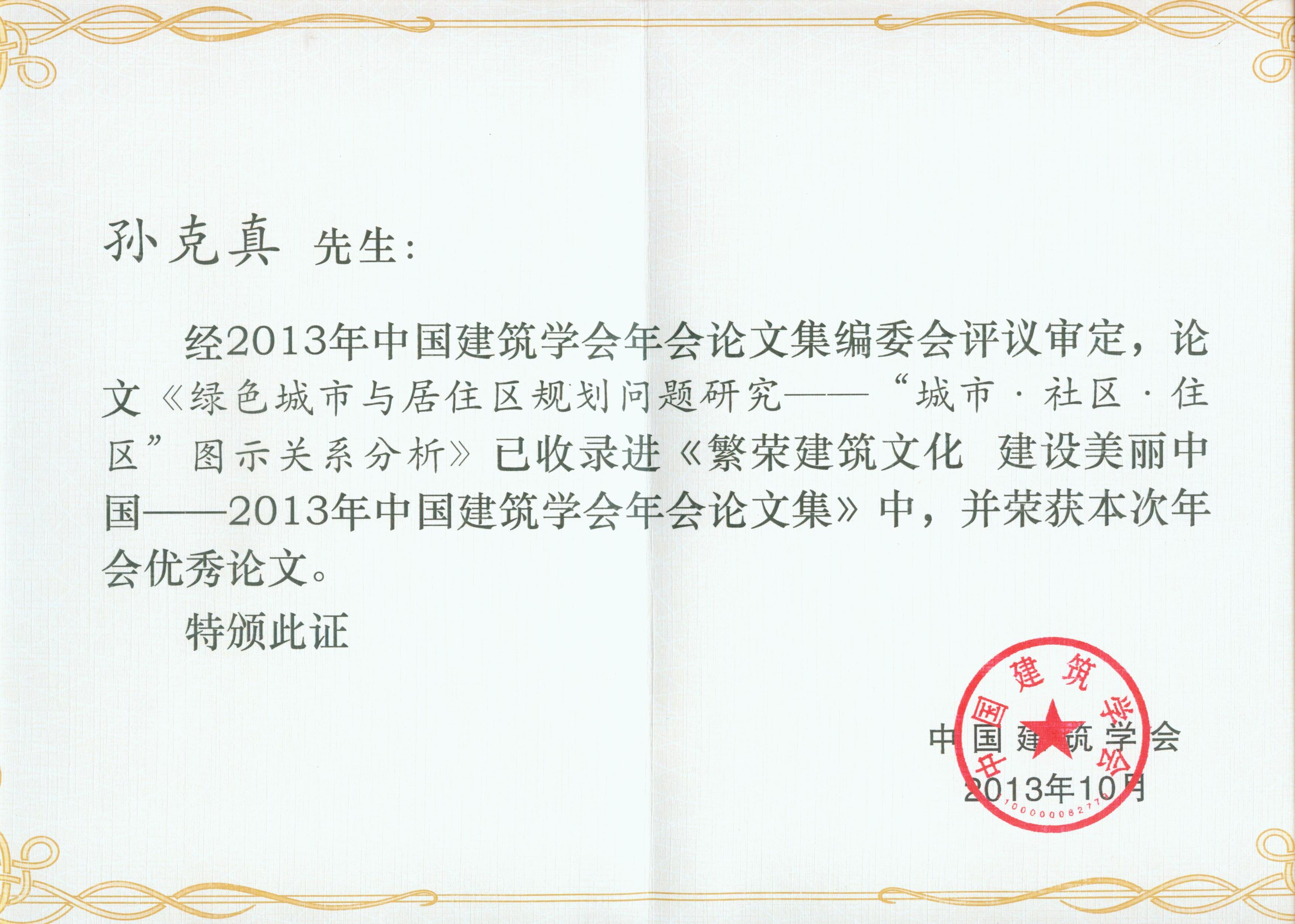 经过中国建筑学会论文集编辑评审委员会及有关分会专家的审阅,共有74篇论文被收录到《繁荣建筑文化,建设美丽中国——2013年中国建筑学会年会论文集》中,并由中国建筑工业出版社出版。其中共有24篇论文被评选为优秀论文。在中国建筑学会评审的24篇优秀论文中,公司有5篇论文获优秀论文奖,其中建筑学系孙克真老师、建筑史论部赵晓梅老师、建研11-1班白雪同学的三篇优秀论文在分论坛:“乡土建筑传承与美丽乡村建设”论坛上进行了论文宣讲交流。
