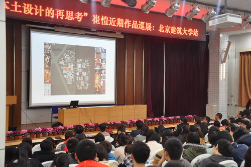 开幕式结束后,崔愷院士在第二阶梯教室进行了题为“本土设计——以土为本的理性主义”的专题学术报告。报告中,崔愷先生结合其工作室近十年来的十六个经典项目案例进行了深度分析,针对“本土设计及理性主义”的理念进行了阐述。“本土设计”的核心,就是对环境——物质环境与精神环境——的理解和尊重。它有助于中国当今社会核心的文化理念在建筑中的具体推行,提倡回归理性的思考,反对浮夸的,以吸引眼球为目的的形式主义和时尚追风;承担起对人居环境的长久责任,秉持立足本土文化的创新主张,积极的从传统文化中吸取营养面向未来;追求保持和延续不同地域环境的建筑特色,反映当代新的地域文化和地域精神。