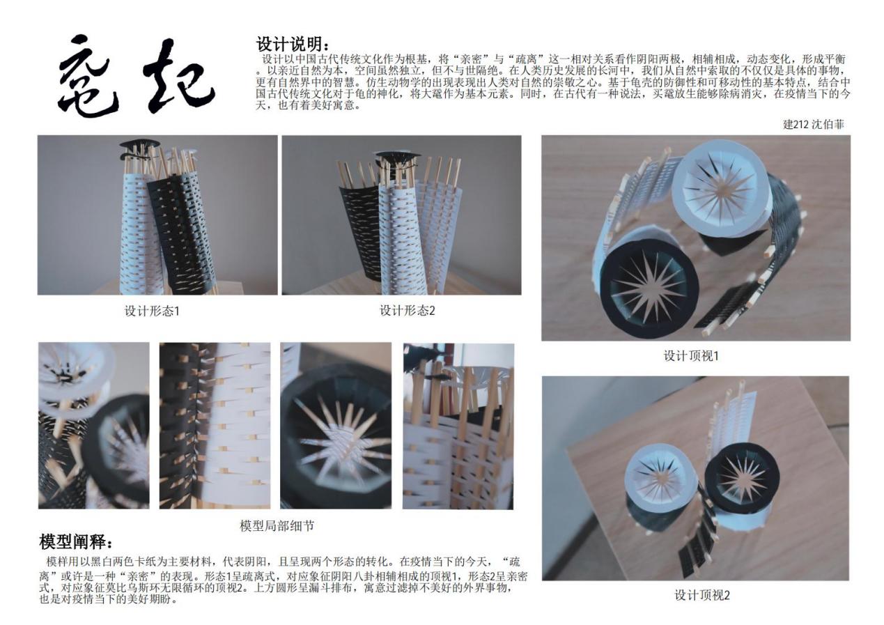 设计者参赛感言:虽然因为疫情的原因很遗憾没能真正参与到2022年同济建造节的活动中,但是通过对于上届建造节的自我演绎还是让我感受到“建造”的魅力。区别于设计课的设计,从材料的选择,到拼接方式,再到最后的呈现,都需要进行把控与判断,在这过程中收获的经验对于我今后的设计也大有裨益,思考永存。此外,老师的建议让我意识到在今后的学习中需要努力的方向,收获良多。