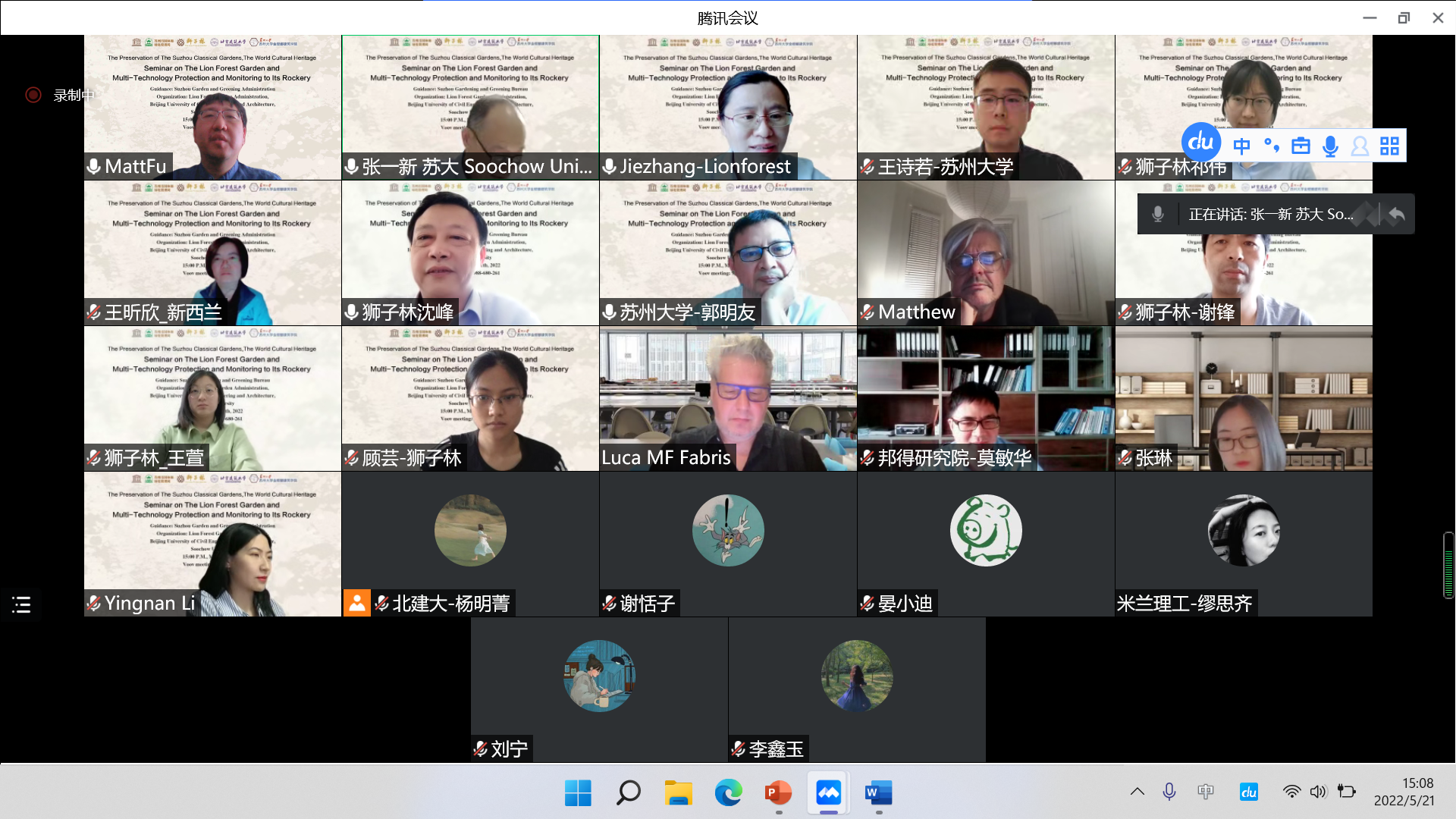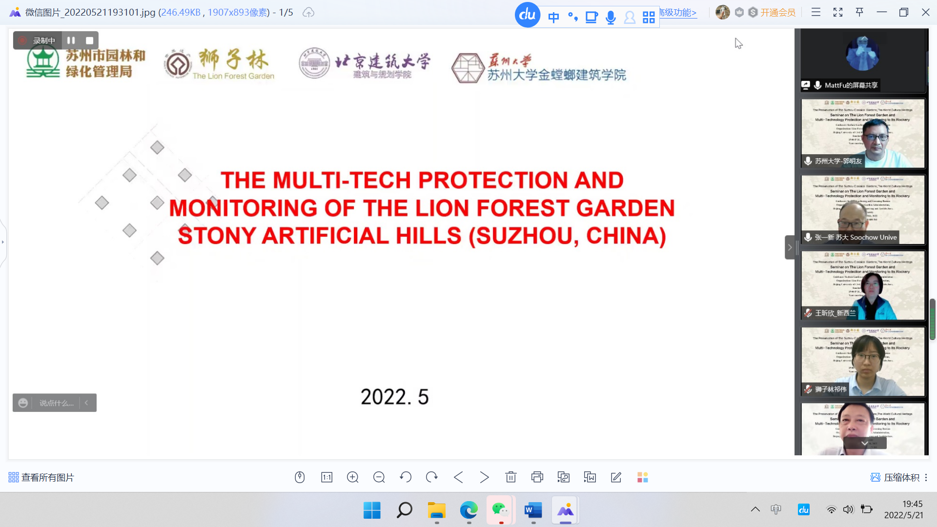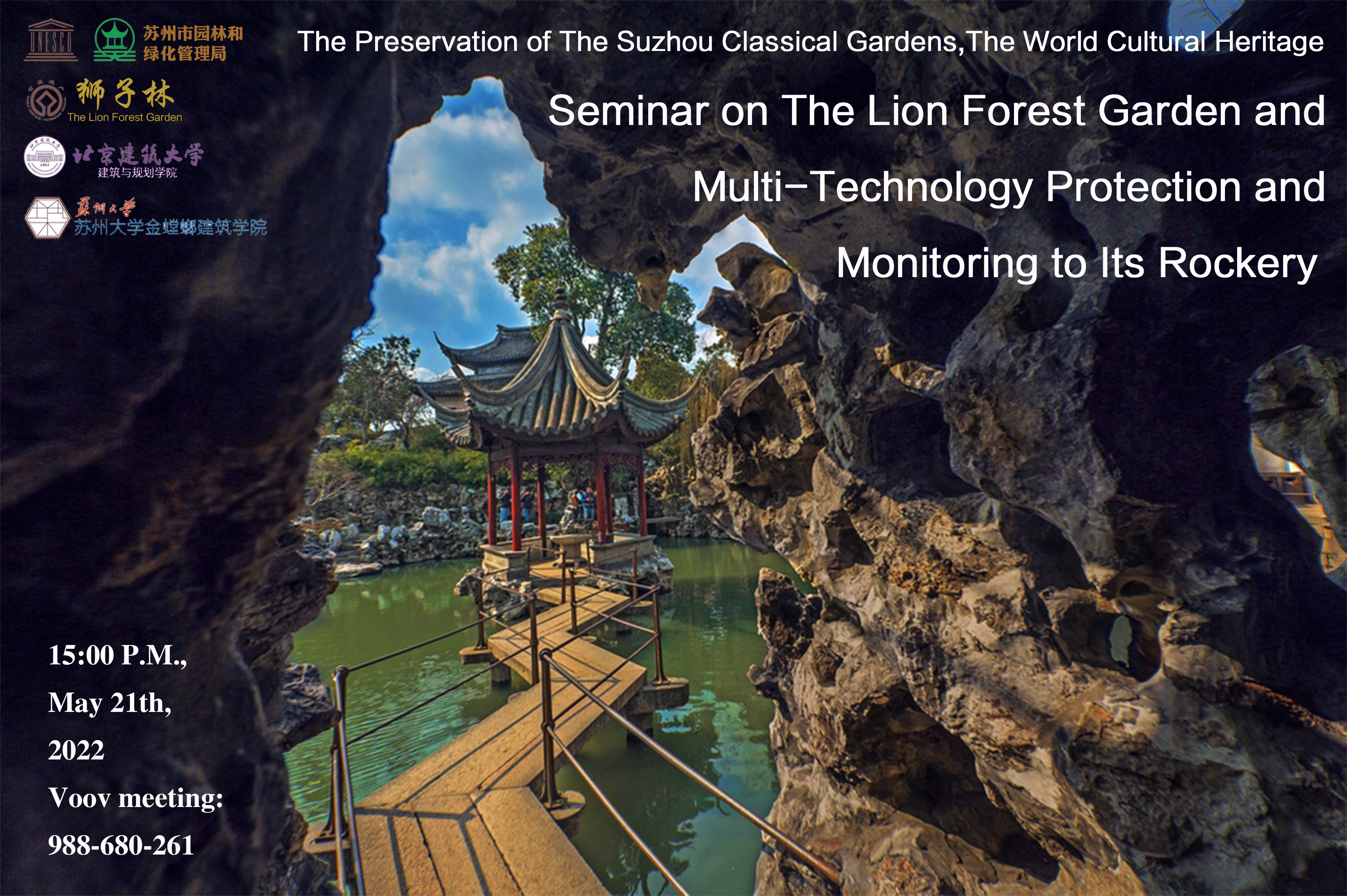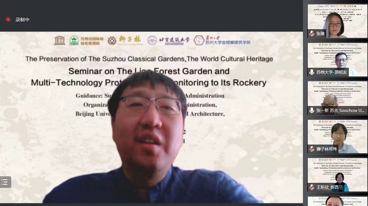 5月21日,“园林保护融合互鉴——苏州园林石质假山保护监测技术中外专家线上交流会”举行,本次会议由苏州市园林和绿化管理局主办,苏州市狮子林管理处、十大正规买足球网站十大正规买足球网站风景园林生态与工程技术实验室、苏州大学金螳螂十大正规买足球网站承办。来自苏州市园林和绿化管理局、苏州市狮子林管理处、十大正规买足球网站、苏州大学、米兰理工大学、新西兰国立理工公司、韩国首尔大学等诸多中外专家学者相聚云端。十大正规买足球网站傅凡教授作为项目技术负责人在线分享了狮子林石质假山保护监测技术方面的成果,与会学者进行了研讨、交流,内容充实,氛围浓厚,互为补充,进一步推动了中外遗产保护交流互鉴,深化了“文化遗产保护与人类命运共同体”理念。新华网进行了报道。